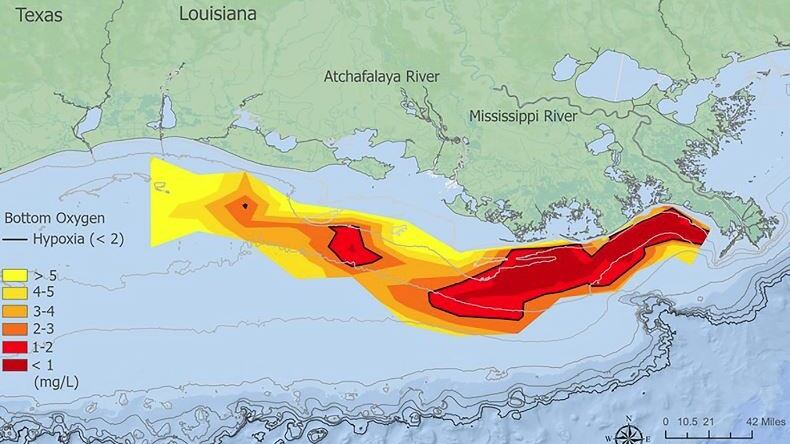 Esta 'sona muerta' se trata de un área con poco o nada de oxígeno que puede matar a los peces y la vida marina, y la NOAA la ha permiterado este año en aproximadamente 3.275 millas cuadradas (5.270 kilómetros cuadrados). Eso equivale a más de 8.000 kilómetros cuadrados de hábitat potencialmente no disponible para peces y especies de fondo.
