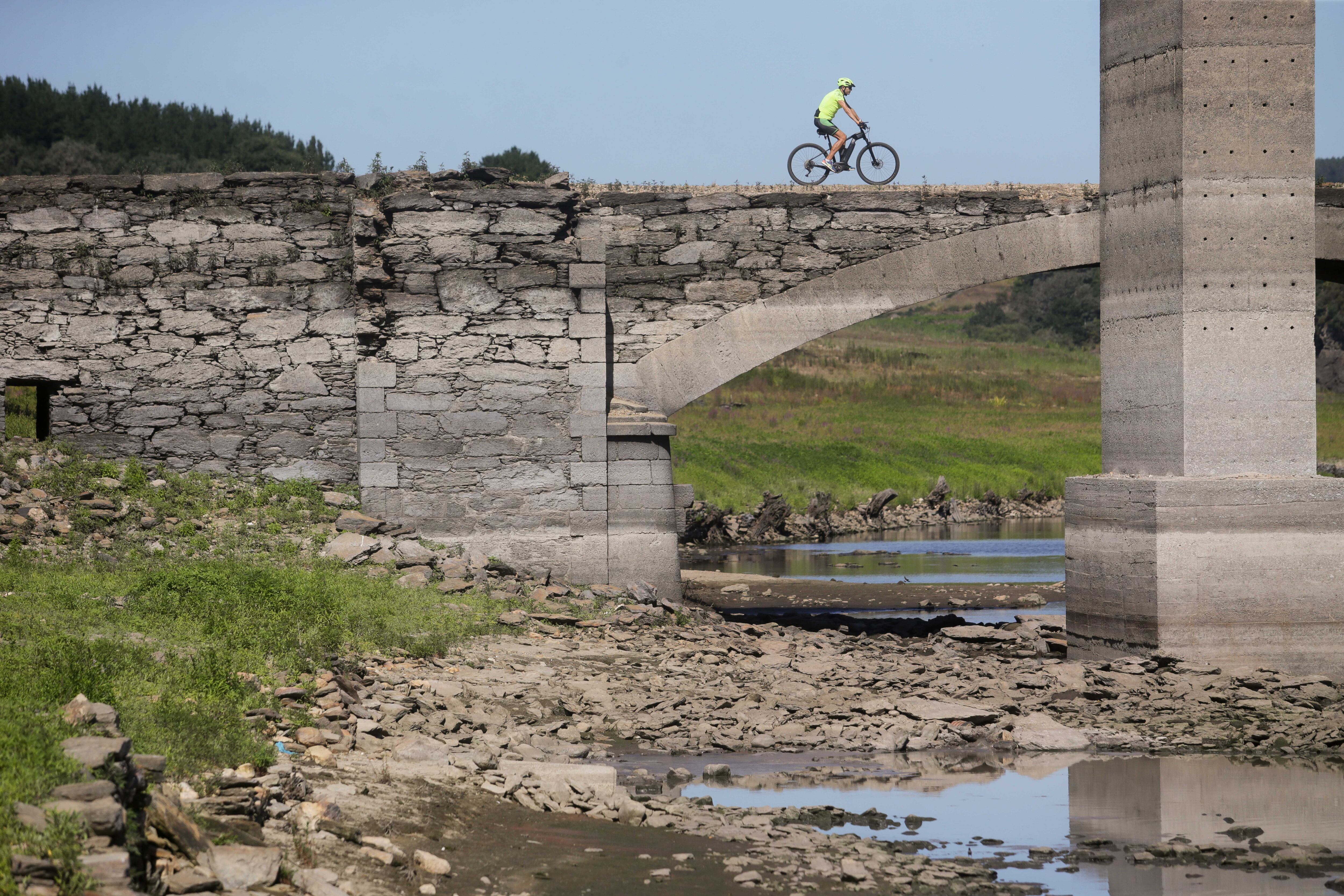 Un ciclista pasa por encima del viejo puente sobre el Miño, sepultado por las aguas en 1962 y visible cuando el cauce transcurre muy bajo, a 27 de julio de 2022, en Lugo, Galicia, (España). La costa gallega lleva en prealerta por sequía meteorológica Carlos Castro - Europa Press (Carlos Castro/Europa Press/Europa Press)