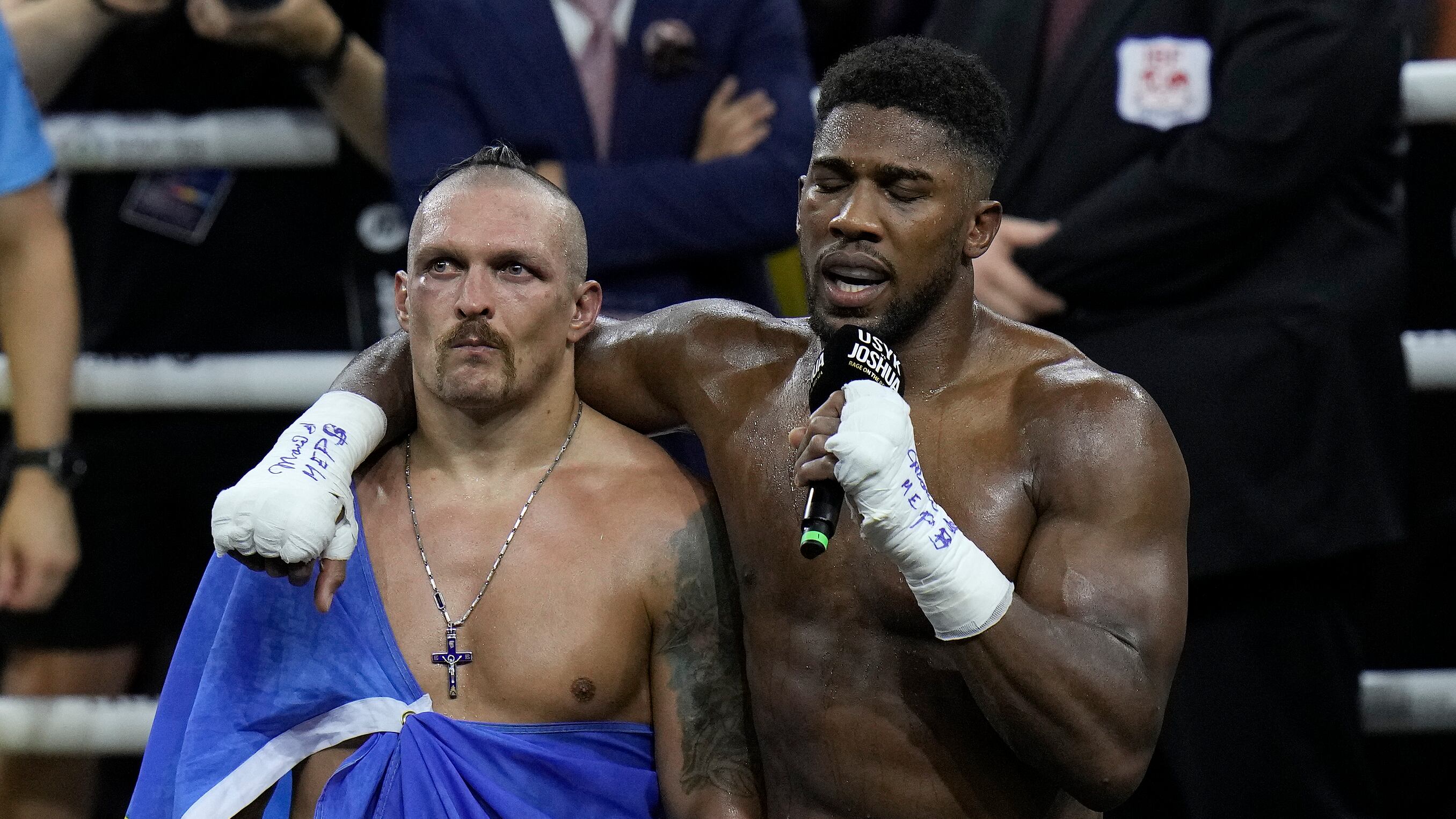 Los dos boxeadores estaban exhaustos al sonar la campana final. Usyk cayó a la lona y miró al cielo. Joshua se le unió poco después, lo abrazó y le dijo algo sobre el sufrimiento de la gente en Ucrania.