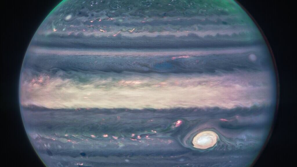Las fotografías difundidas permiten ver que las auroras se extienden a grandes altitudes sobre los polos norte y sur de Júpiter. Estas imágenes proceden de la cámara de infrarrojo cercano (NIRcam), que tiene tres filtros infrarrojos. “Es realmente notable que podamos ver detalles de Júpiter junto con sus anillos, pequeños satélites e incluso galaxias en una sola imagen”, añade.