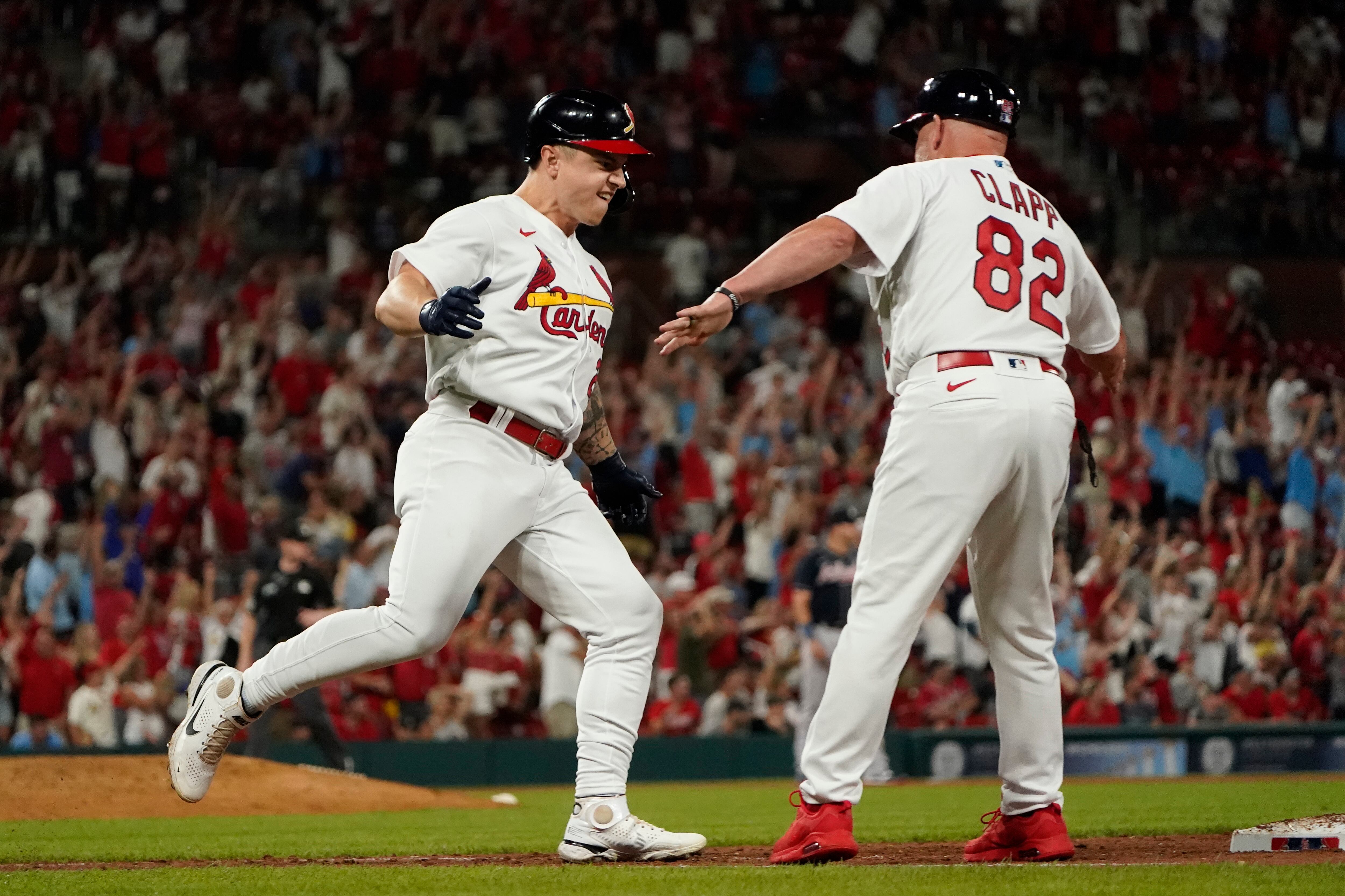Tyler O'Neill, de los Cardenales de San Luis, es felicitado del entrenador de primera base Stubby Clapp (82), luego de pegar un cuadrangular ante los Bravos de Atlanta, el domingo 28 de agosto de 2022, en San Luis. (AP Foto/Jeff Roberson) AP (Jeff Roberson/AP)