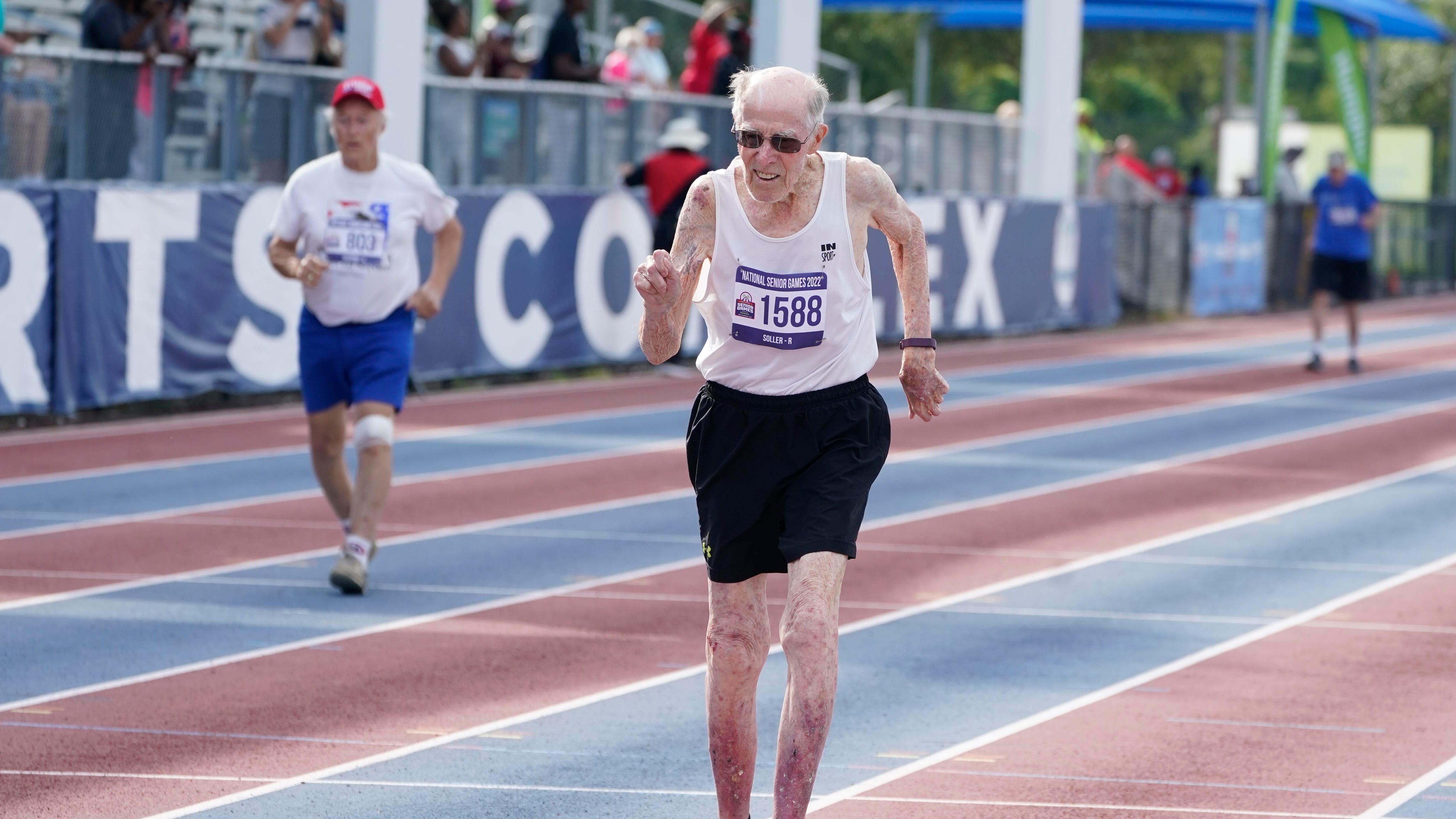 En un sector sin terminar del sótano de su casa, el nonagenario Richard Soller trota por una pista improvisada alrededor de cajas llenas de medallas que ganó como corredor de corta y larga distancia.