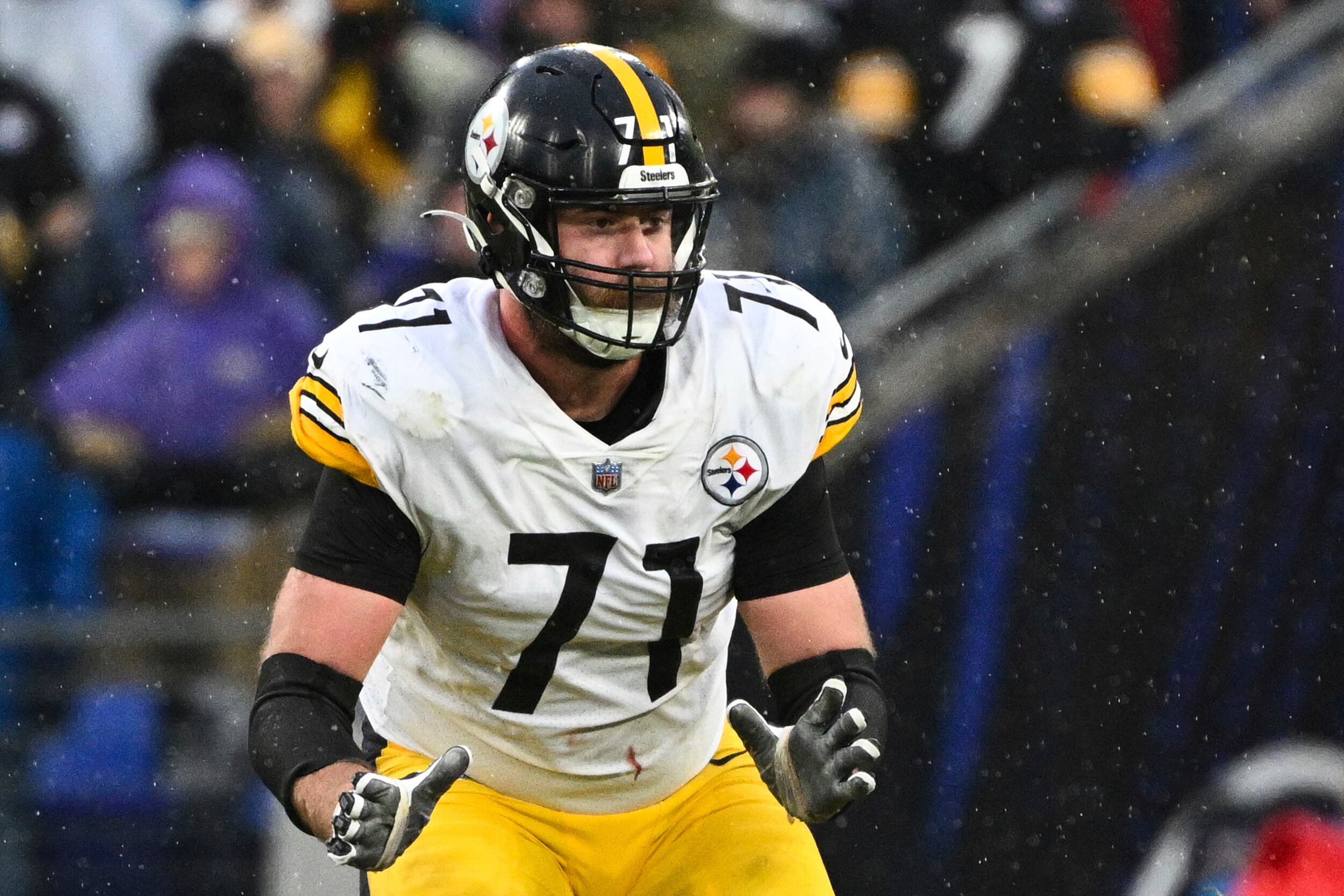 ARCHIVO - Foto del 9 de enero del 2022, el tackle ofensivo de los Steelers de Pittsburgh Joe Haeg disputa el tiempo extra del encuentro ante los Ravens de Baltimore. El lunes 5 de septiembre del 2022, los Browns de Cleveland firmaron al offensive tackle J AP (Terrance Williams/AP)