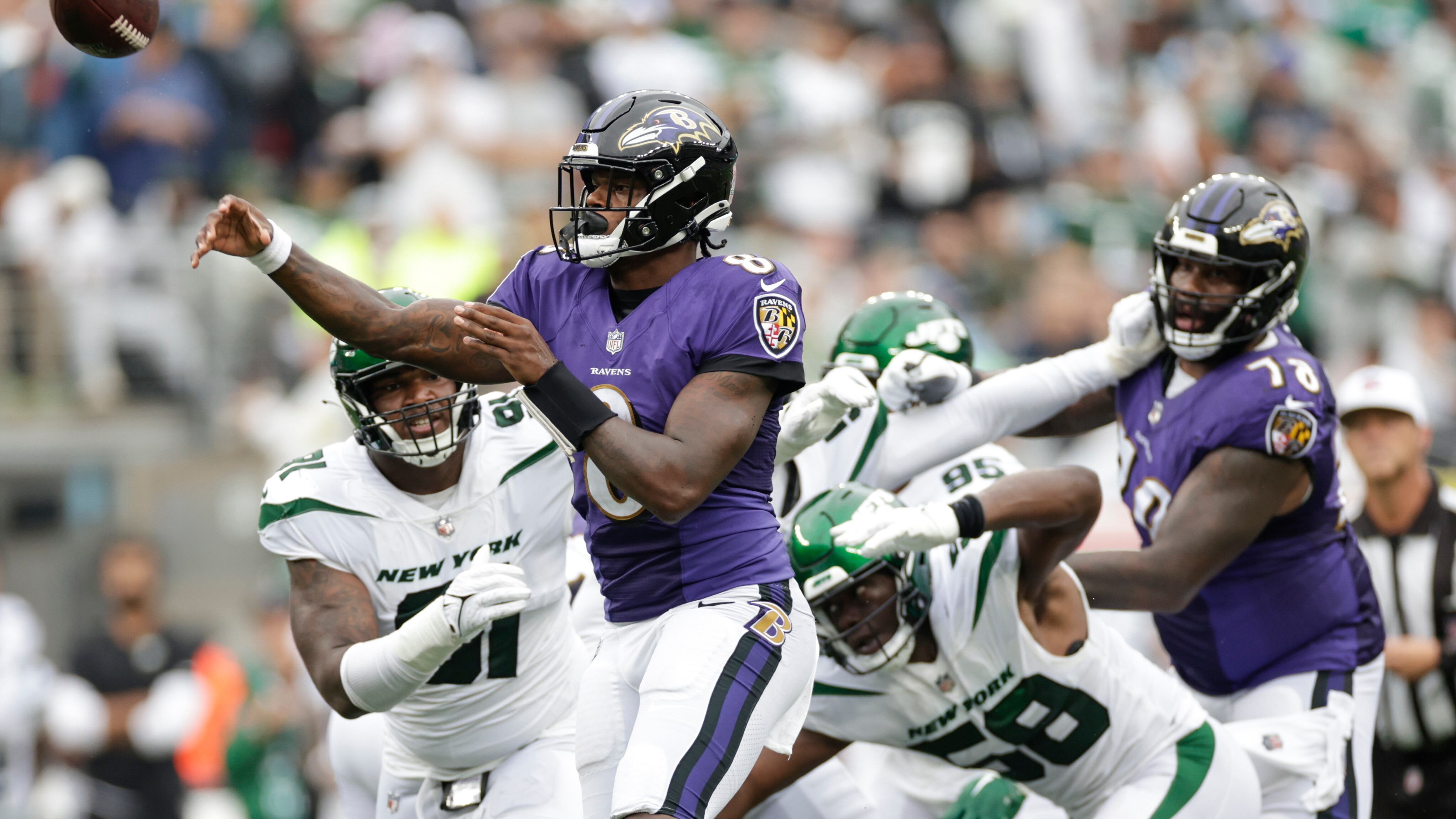 EAST RUTHERFORD, Nueva Jersey, EE.UU. (AP) — Lamar Jackson lanzó tres pases de touchdown, dos de ellos a Devin Duvernay, y los Ravens de Baltimore vencieron cómodamente 24-9 a los Jets de Nueva York en un lluvioso domingo.