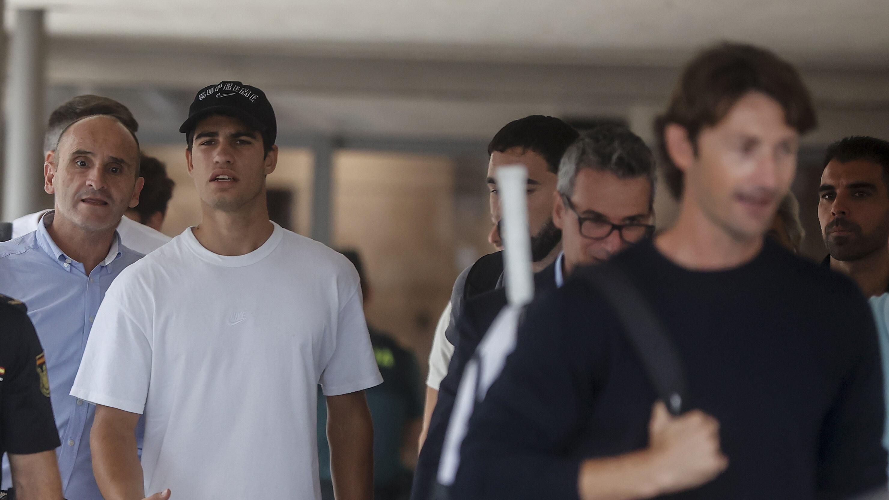 El tenista murciano Carlos Alcaraz (2i) a su llegada al aeropuerto de Valencia, a 13 de septiembre de 2022, en Valencia, Comunidad Valenciana (España). Tras la conquista del Abierto de los Estados Unidos, cuarto y último 'Grand Slam' de la temporada, Al Rober Solsona - Europa Press (rober solsona/Europa Press)