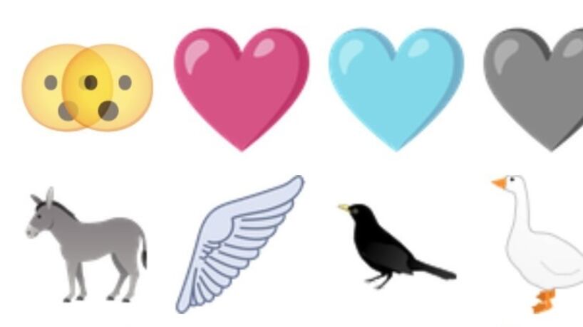 De la parte de los emoji, el estándar incluye instrumentos musicales como unas maracas y una flauta; elementos de la naturaleza, como la flor del jacinto, una raíz de jengibre o una vaina de guisantes; animales, como un ganso, la cabeza de un alce, un burro, un ala gris y un pájaro negro; y objetos como una peineta y un abanico; y corazones de color gris, azul claro y rosa plano.