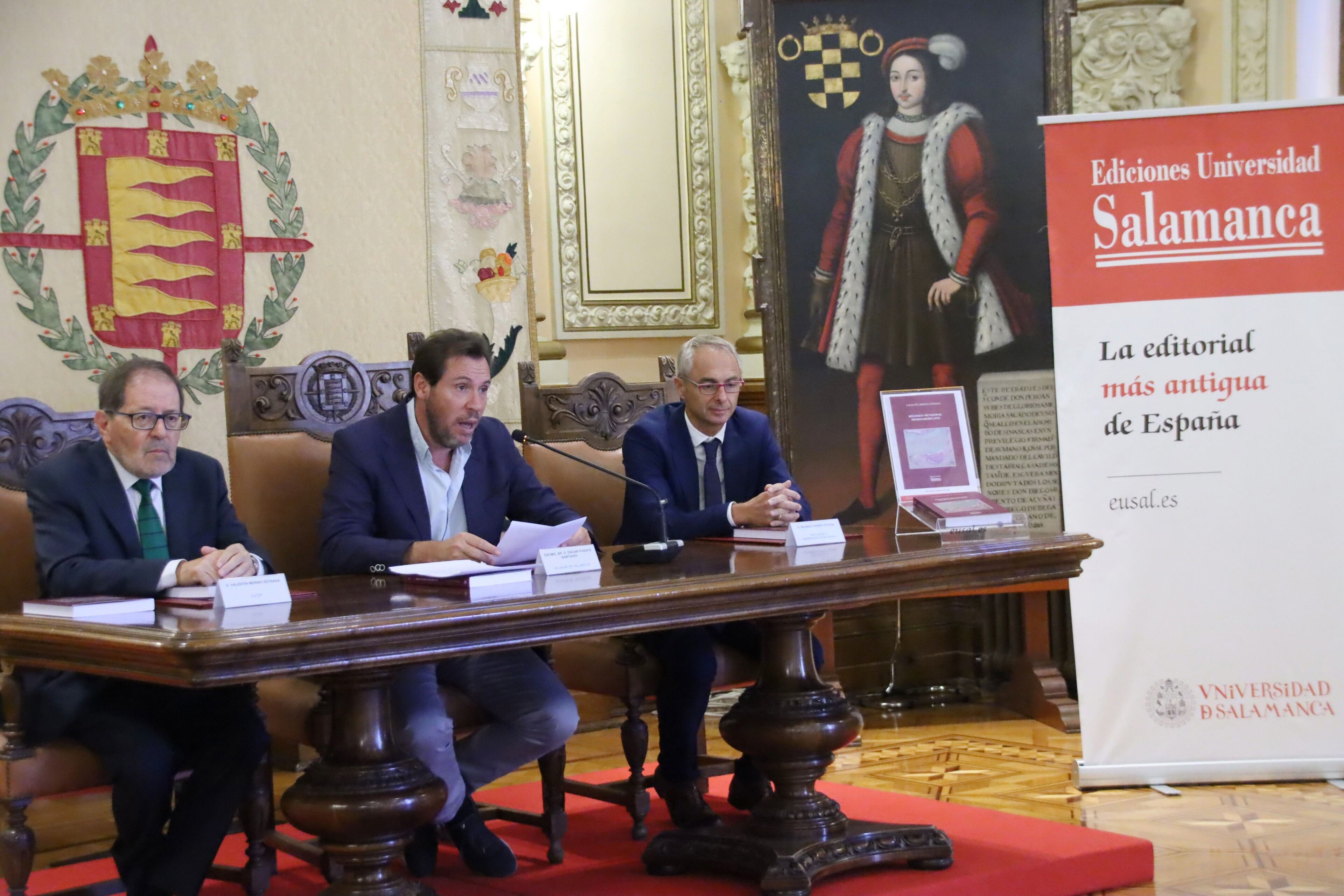 Puente y el autor han estado acompañados por el rector de la Universidad de Salamanca, Ricardo Rivero Ortega, en la presentación del libro en el Salón de Recepciones del Ayuntamiento de la capital.