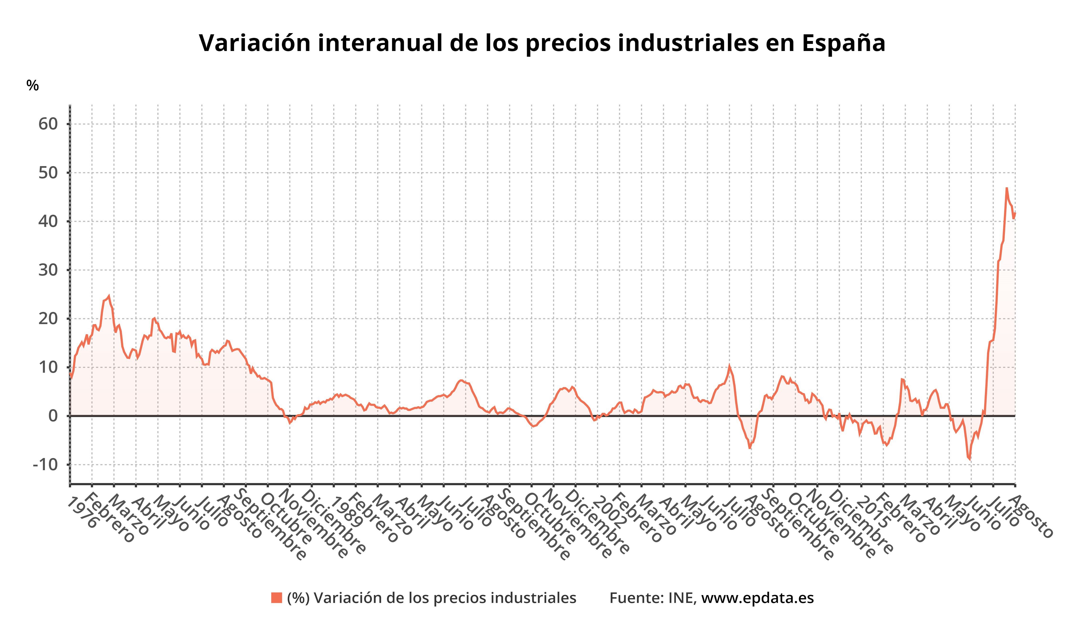 Tras cuatro meses seguidos en los que la tasa interanual se fue moderando mes a mes, los precios industriales han vuelto a coger carrerilla en agosto, pero sin llegar a los máximos alcanzados el pasado mes de marzo, cuando subían a un ritmo del 47%.