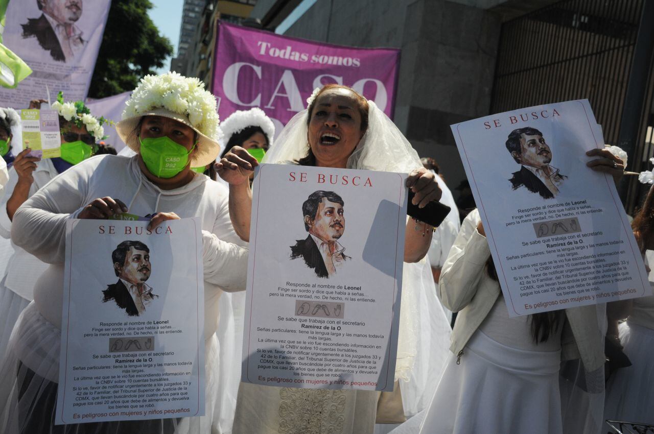 Vestidas de novias, con cubrebocas verdes y pañuelos violeta exigieron a las autoridades capitalinas avalar la propuesta que inició como movimiento en 2019, que busca que los padres que no cumplan con la pensión alimentaria para sus hijos lo hagan.
