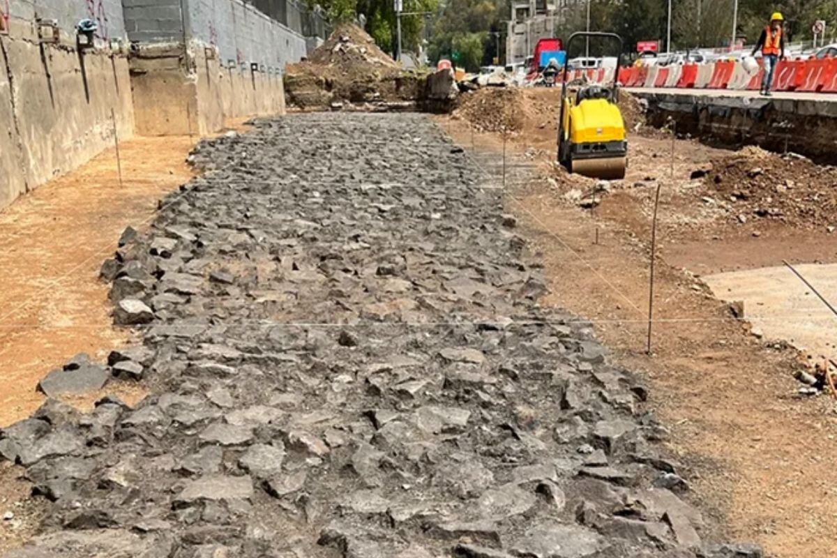 Fue durante las excavaciones para el cajón de cimentación de la nueva estación del Metrobús y Mexibús, sobre la avenida Insurgentes Norte, donde se halló un camino empedrado. Este elemento, del que se registraron aproximadamente 45 metros de longitud, apareció a una profundidad de 62 centímetros y se construyó con roca basáltica recubierta con grava negra, sobre la cual se colocó una carpeta asfáltica de 6 milímetros de grosor.