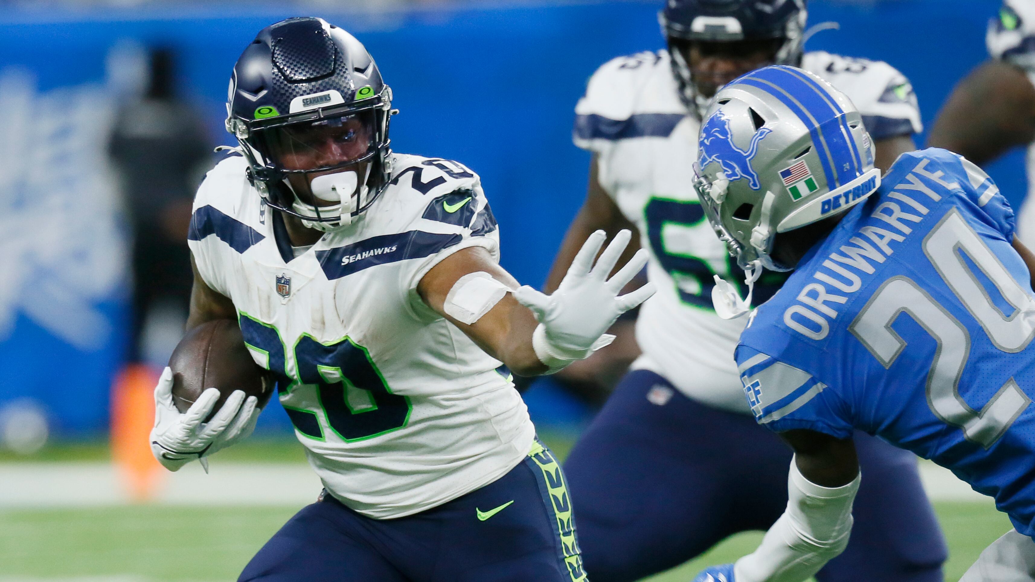 Los Seahawks (2-2) fueron frenados en tercera oportunidad en la parte final del tercer cuarto, pero el reloj de jugada del estadio Ford Field no estaba bien configurado. Seattle tomó ventaja con una segunda oportunidad y de la desorganizada defensiva de Detroit con un acarreo de anotación de Rashaad Penny de 36 yardas, para abrir una ventaja 38-23.