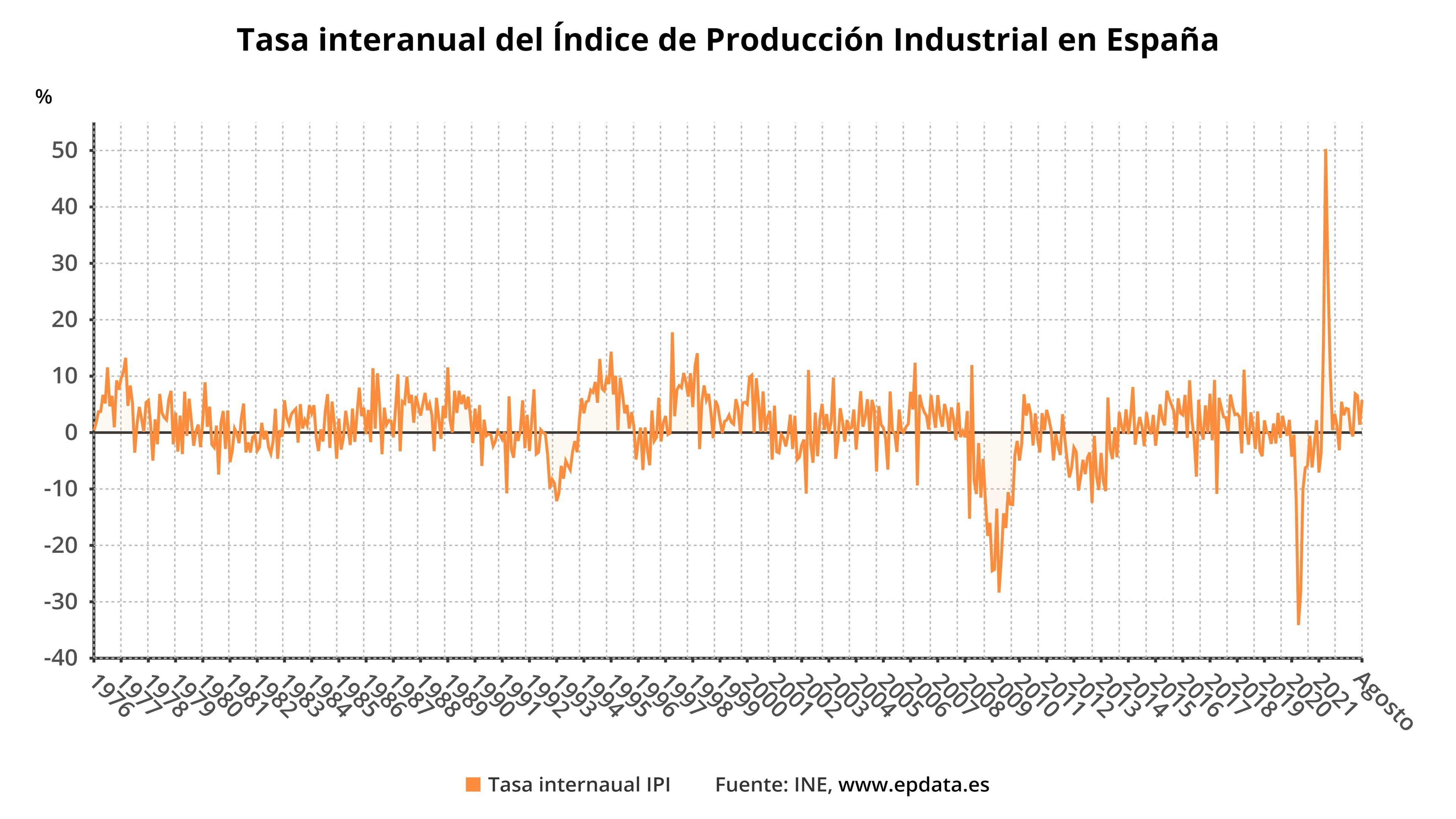 Evolución interanual del índice de producción industrial de España (INE) EPDATA