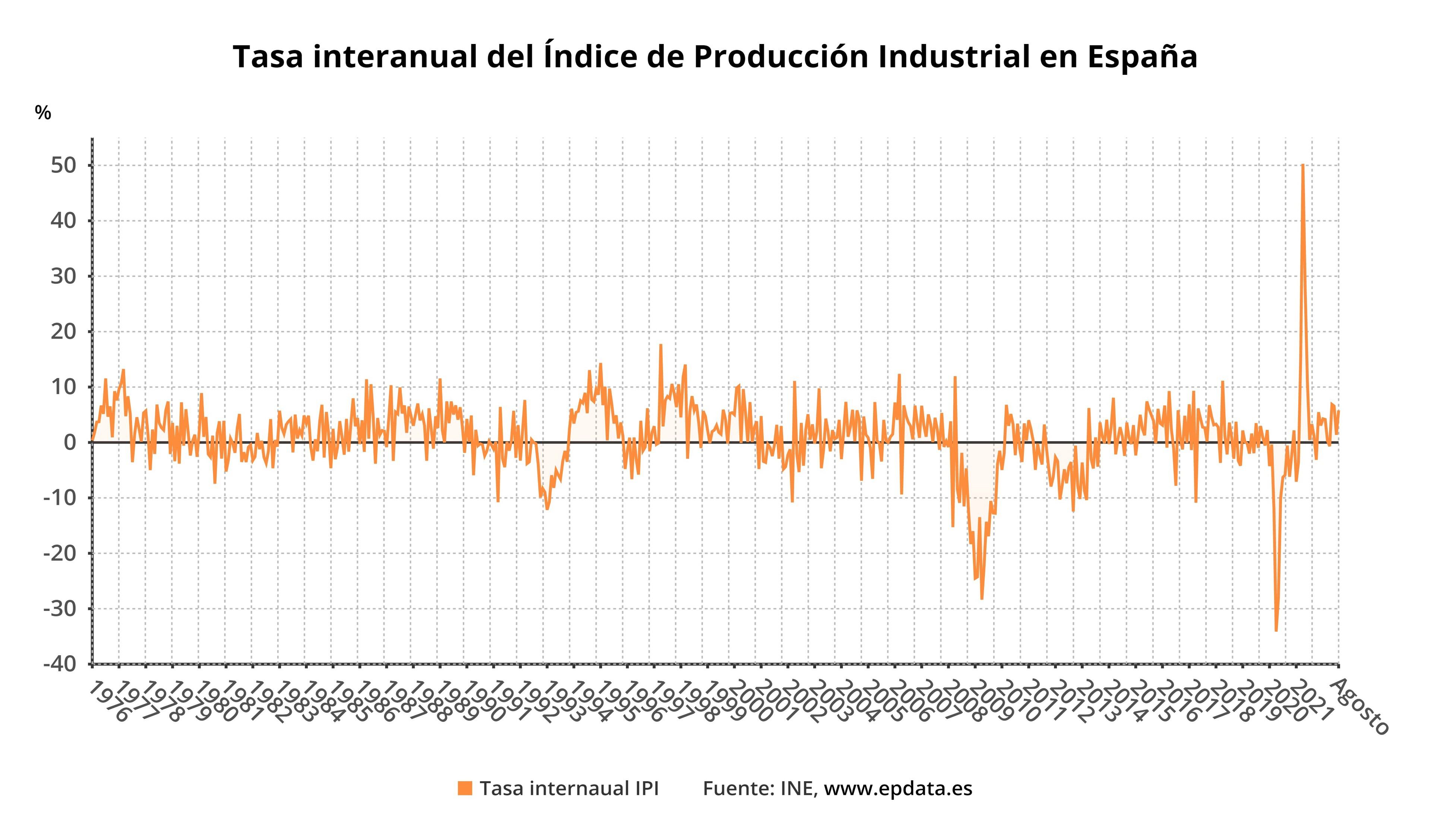 Evolución interanual del índice de producción industrial de España (INE) EPDATA