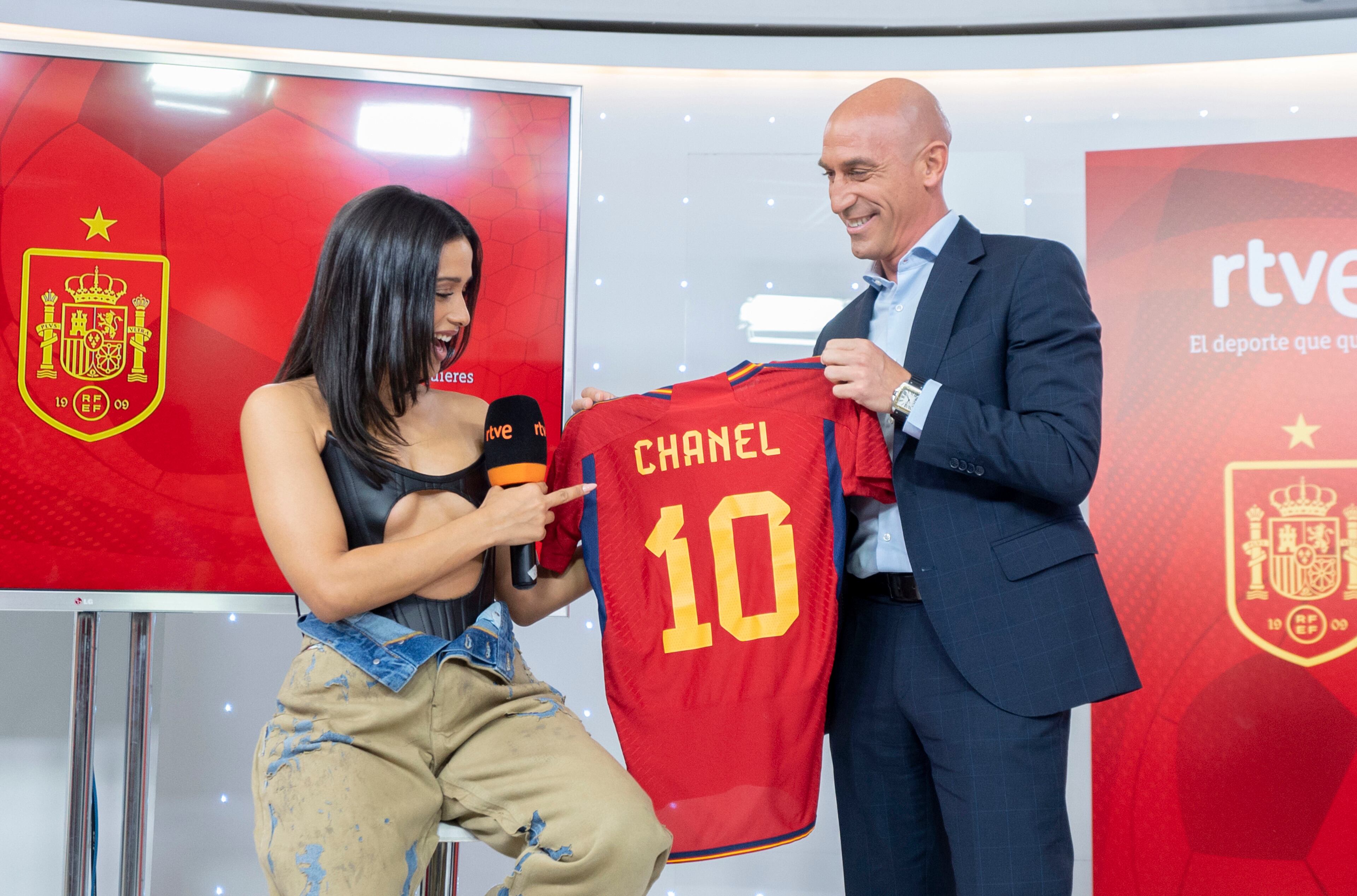 "Estoy muy feliz por 'Sony', por nosotros y por contar con una artista de primer nivel y un orgullo para nuestro país. La selección también es pasión y para alguien que quiere a su país y ama el fútbol, su selección es lo máximo", sentenció Rubiales, que entregó a Chanel una camiseta de la 'Roja' con su nombre y el número '10'.