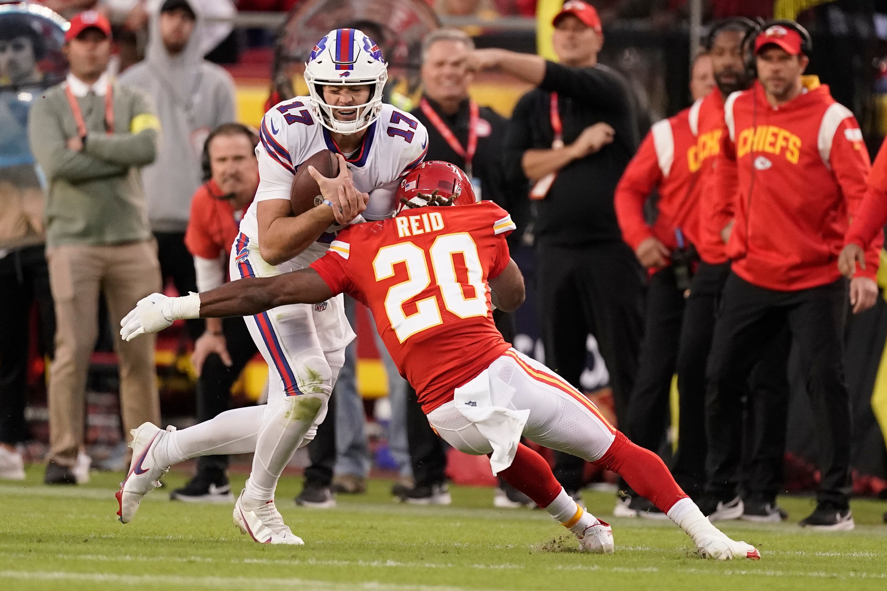 Josh Allen (17), quarterback de los Bills de Buffalo, es detenido por el safety Justin Reid (20), de los Chiefs de Kansas City, durante la segunda mitad del partido de la NFL, el domingo 16 de octubre de 2022, en Kansas City, Mo. (AP Foto/Charlie Riedel) AP (Charlie Riedel/AP)