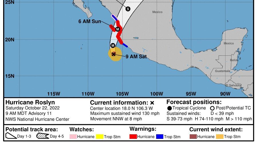 "El huracán Roslyn impactó como categoría 3 a las 06.20 horas, tiempo del centro de México (13.20 en España), en la localidad de Santa Cruz, el municipio de Santiago Ixcuintla, el estado de Nayarit", en el centro-oeste del territorio mexicano, informó el SMN.