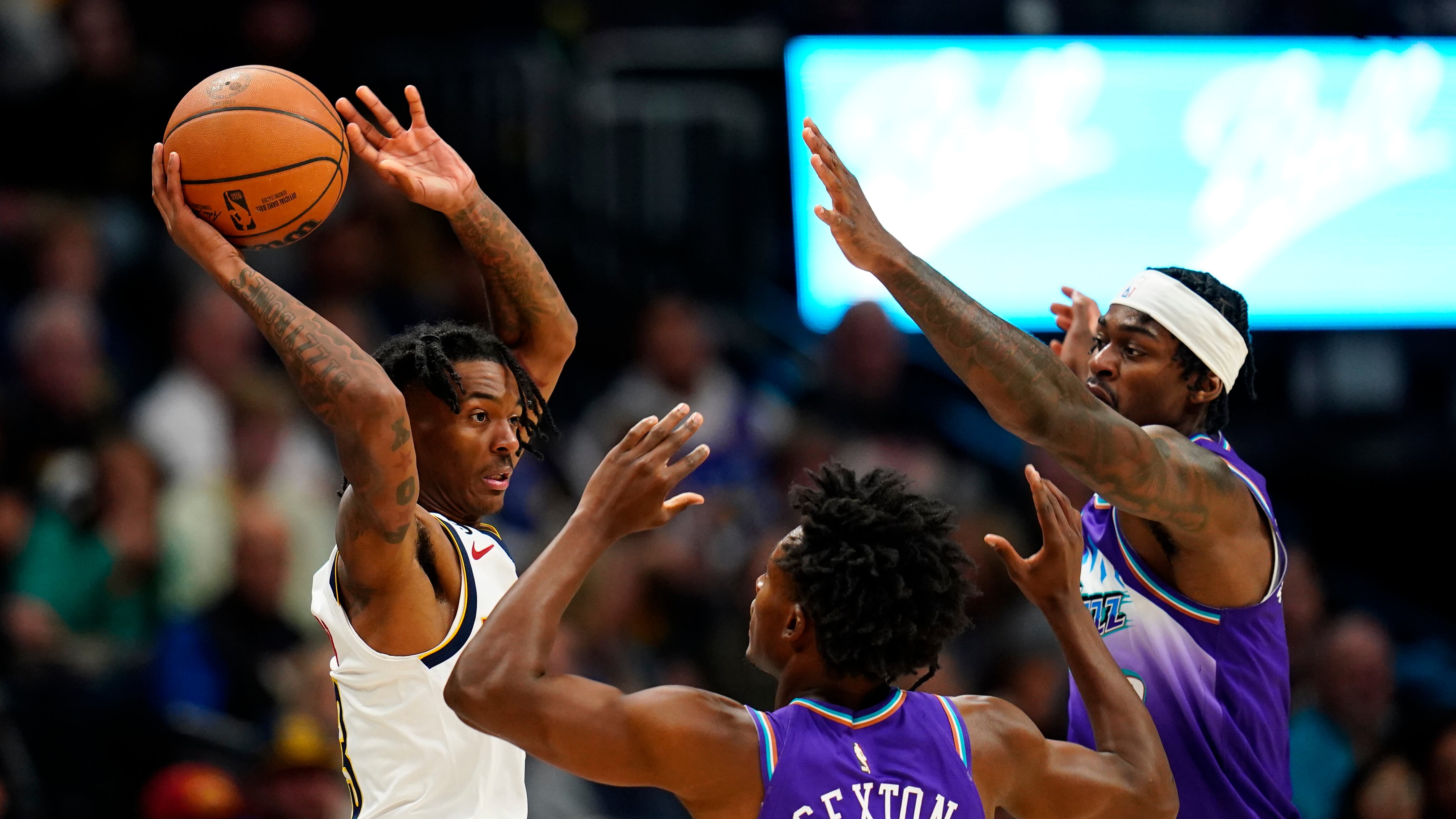 Bones Hyland, izquierda, de los Nuggets de Denver, busca pasar el balón ante la presión de Collin Sexton, centro, y Jarred Vanderbilt, derecha, durante el tercer cuarto del juego de baloncesto de la NBA, el viernes 28 de octubre de 2022, en Denver. (AP AP (Jack Dempsey/AP)