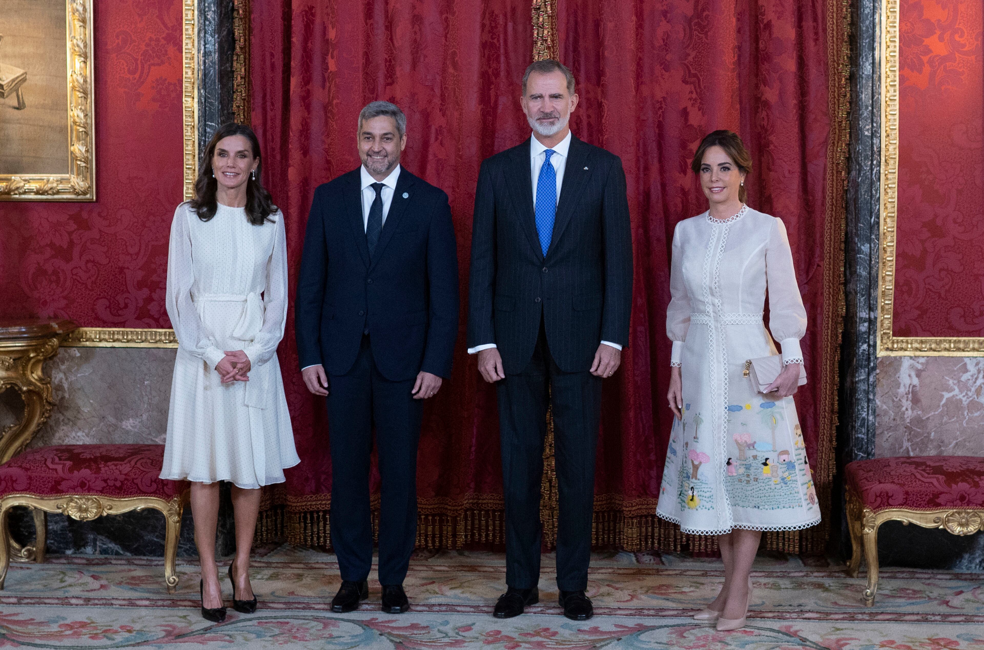 En su intervención, el Rey ha mencionado el viaje para visitar los proyectos de la Cooperación Española que realizó la Reina Letizia hace un año a Paraguay, "del que guarda un grato recuerdo". Doña Letizia ha dado muestras de una gran sintonía con la primera dama paraguaya, Silvana López, con la que ha intercambiado impresiones y comentarios durante el besamanos que ha precedido al almuerzo.