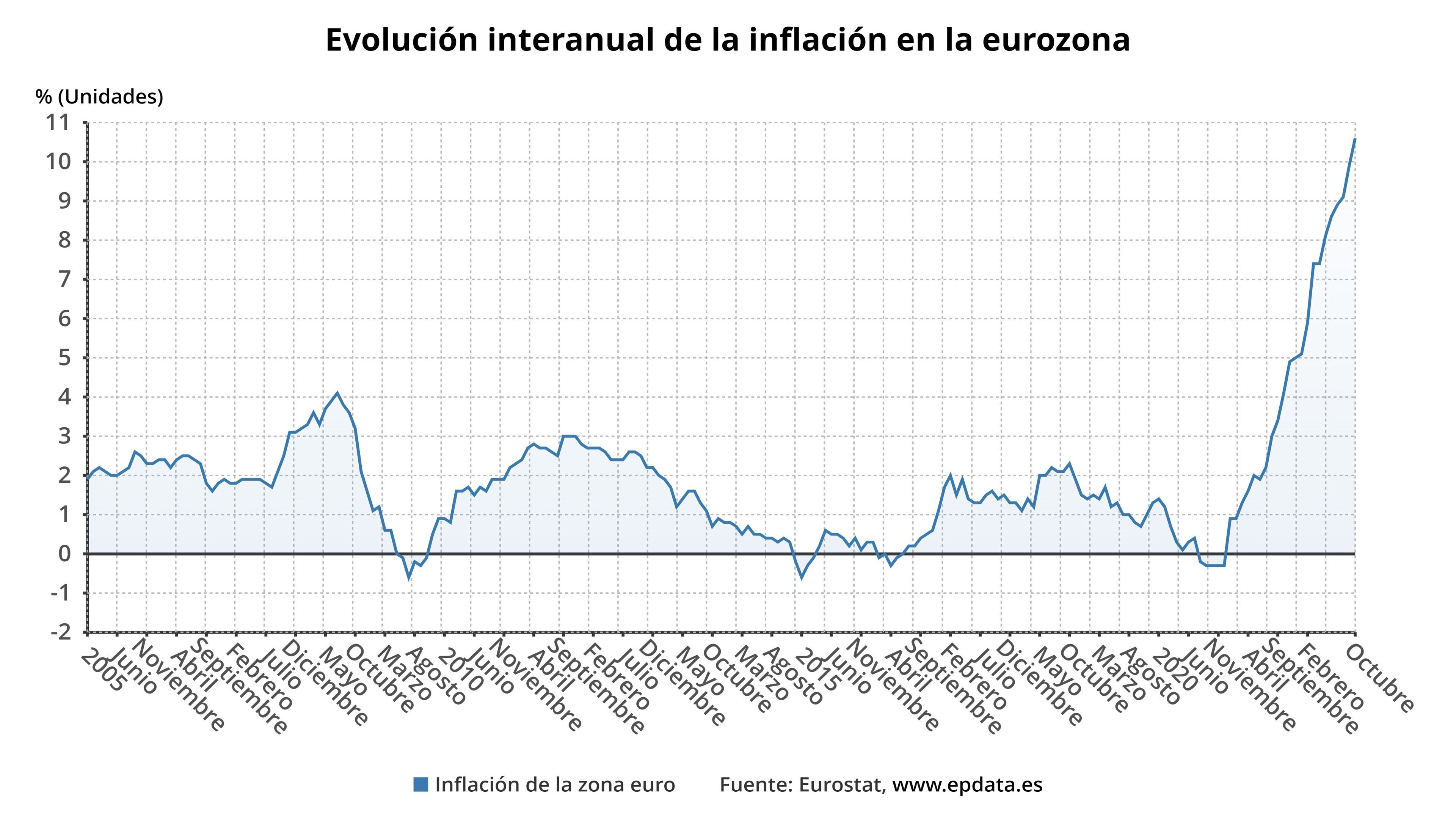 La tasa de inflación interanual de la eurozona se situó en octubre en el 10,6%, lo que marca un nuevo récord histórico y supone una aceleración de siete décimas respecto al dato de septiembre, a pesar de las subidas de los tipos de interés acometidas por el Banco Central Europeo (BCE), según la oficina comunitaria de estadística, Eurostat, que ha rebajado así una décima el dato respecto de la primera estimación.