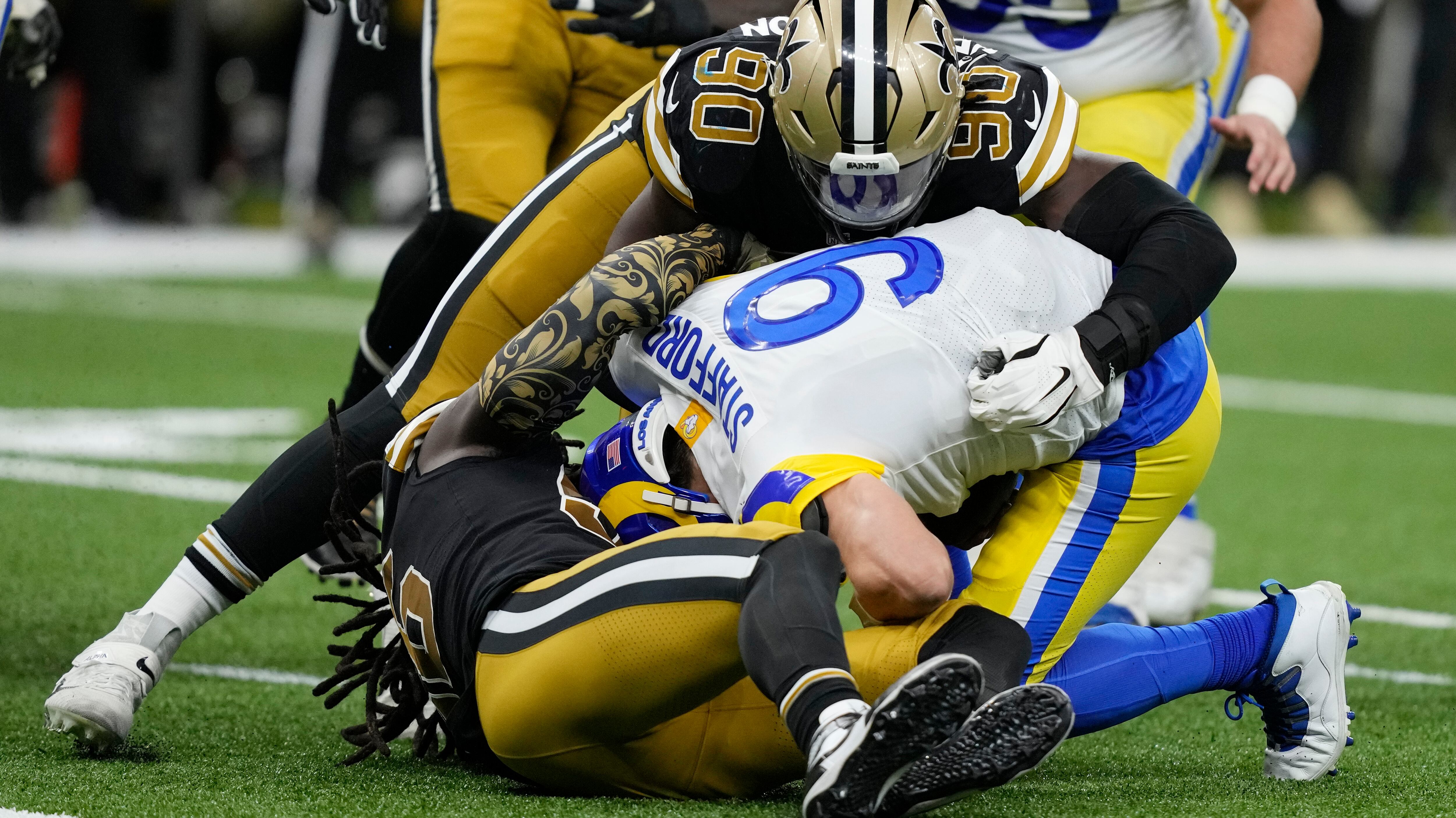 Stafford pareció golpearse la cabeza contra el césped artificial del Superdome durante una posesión del tercer cuarto. Posteriormente fue capturado por el linebacker veloz Demario Davis y el defensive end Tanoh Kpassagnon, lo que puso fin a la última serie en la que participó, antes de irse por el túnel hacia los vestuarios.