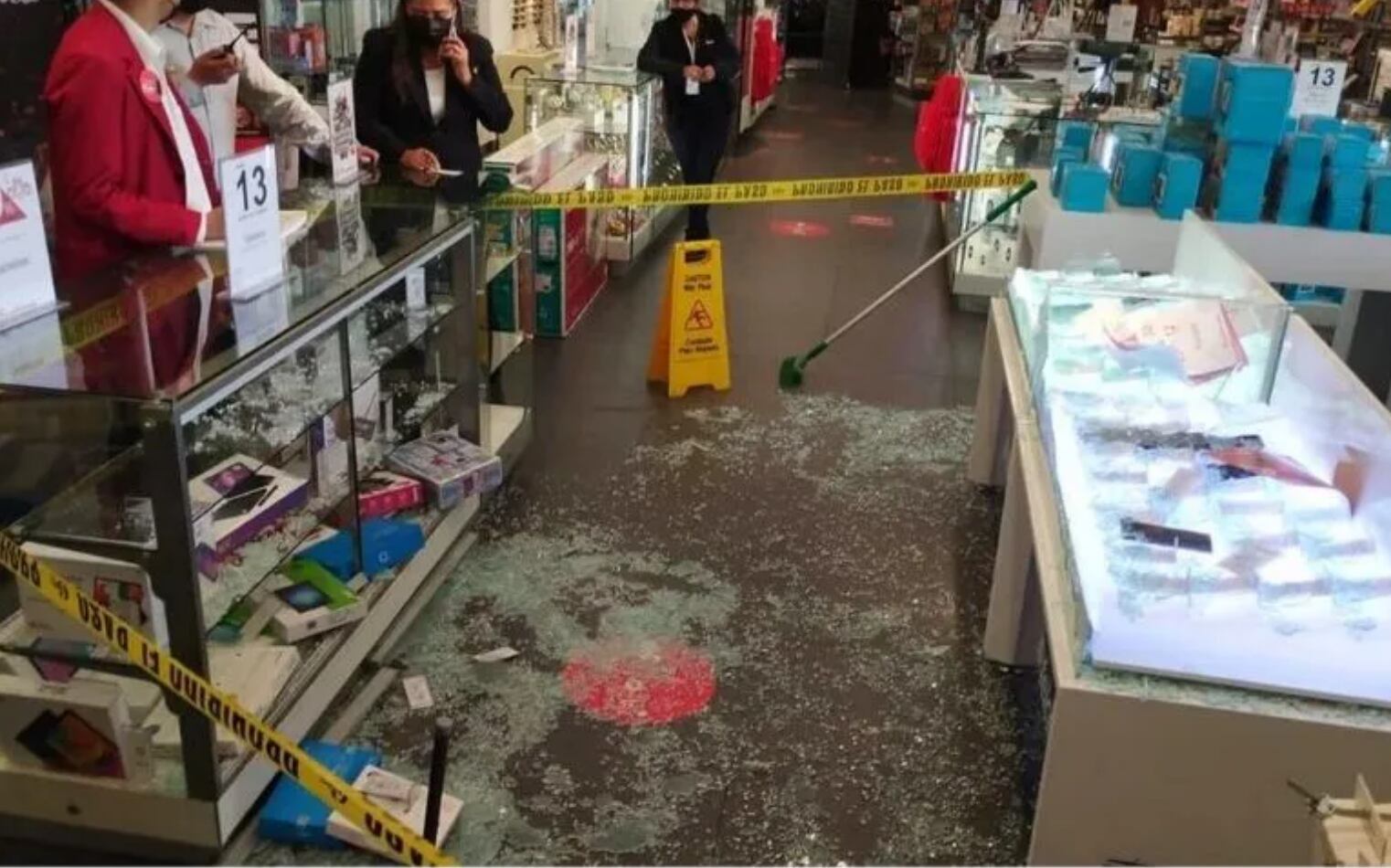 Obligaron a los vigilantes a tirarse al piso para luego empezar a romper vitrinas, especialmente del área de telefonía, joyería y de computadoras, de donde robaron celulares, laptops y otros artículos, informaron fuentes locales.