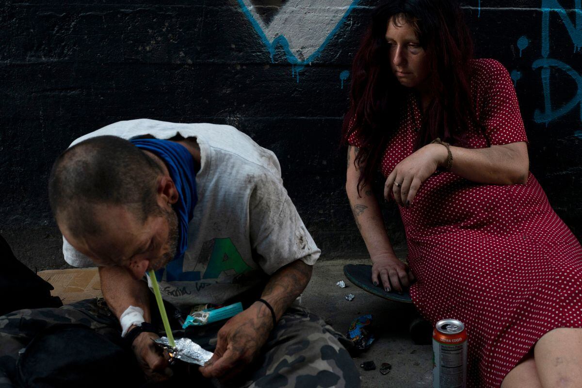 Partes de Los Ángeles se convirtieron en escenarios de desesperación, con hombres y mujeres tumbados en aceras, acurrucados en bancas y desplomados en callejones escuálidos. Algunos se acurrucan fumando la droga, otros se la inyectan.