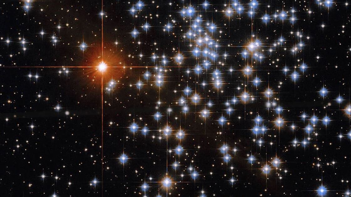 Los picos que rodean a muchas de las estrellas en esta imagen son "picos de difracción", que ocurren cuando el resplandor de los puntos de luz brillantes se refleja en el soporte del espejo secundario del Hubble. El objeto rojo brillante a la izquierda con los picos de difracción muy prominentes es una estrella en primer plano que no forma parte del cúmulo.