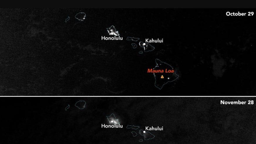 La imagen de arriba fue adquirida a las 12.25 UTC del 28 de noviembre por el instrumento VIIRS (Visible Infrared Imaging Radiometer Suite) en el satélite NOAA-NASA Suomi NPP. A modo de comparación, la imagen por encima muestra la misma área el 29 de octubre de 2022, antes de que comenzara la erupción.