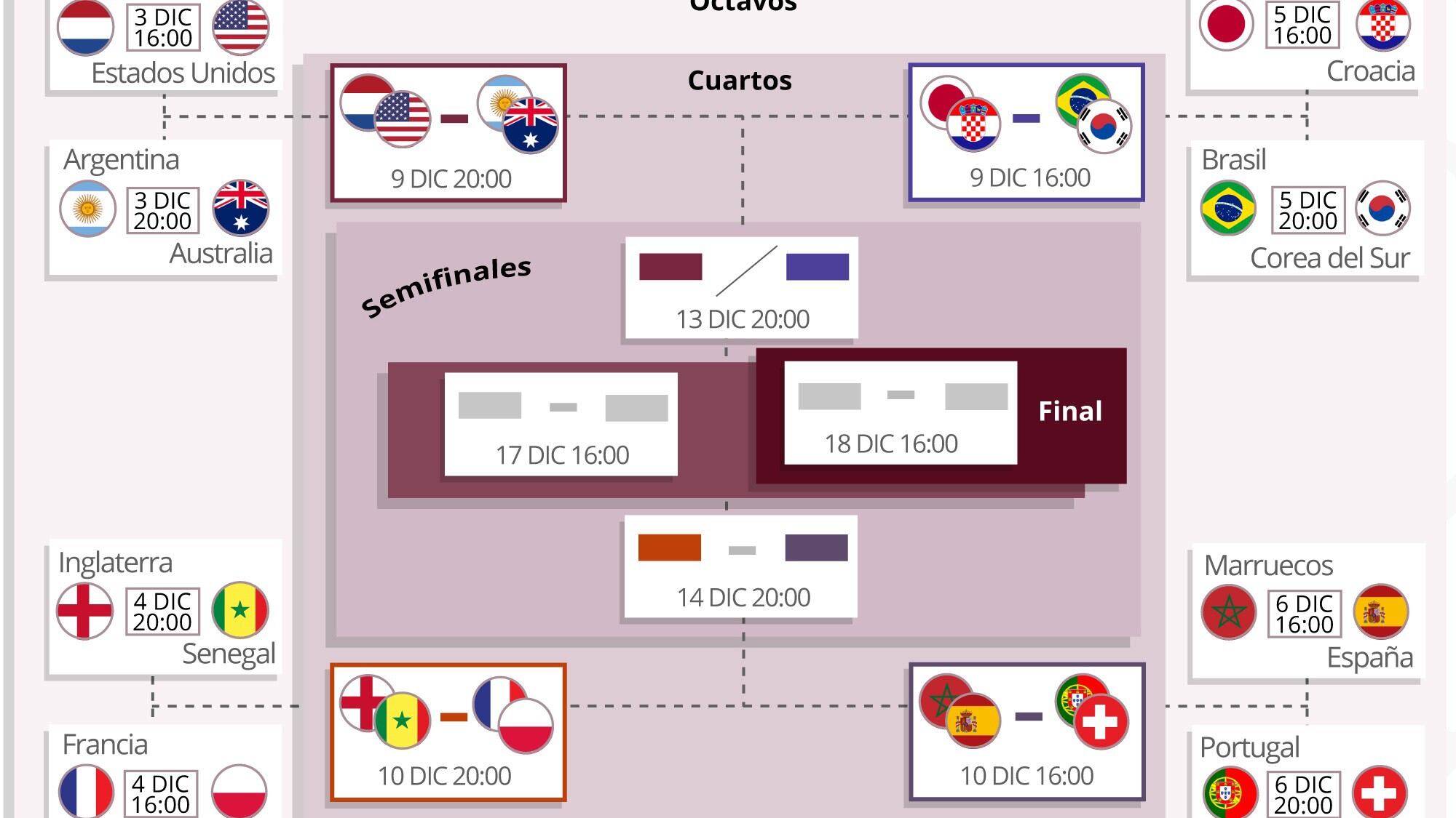 El Mundial de Catar 2022 tiene ya dibujado su camino hasta la final después del cierre este viernes de la fase de grupos, con los cruces de octavos de final que se disputan del 3 al 6 de diciembre y con Argentina, Brasil, Francia y España como favoritas a verse en semifinales.