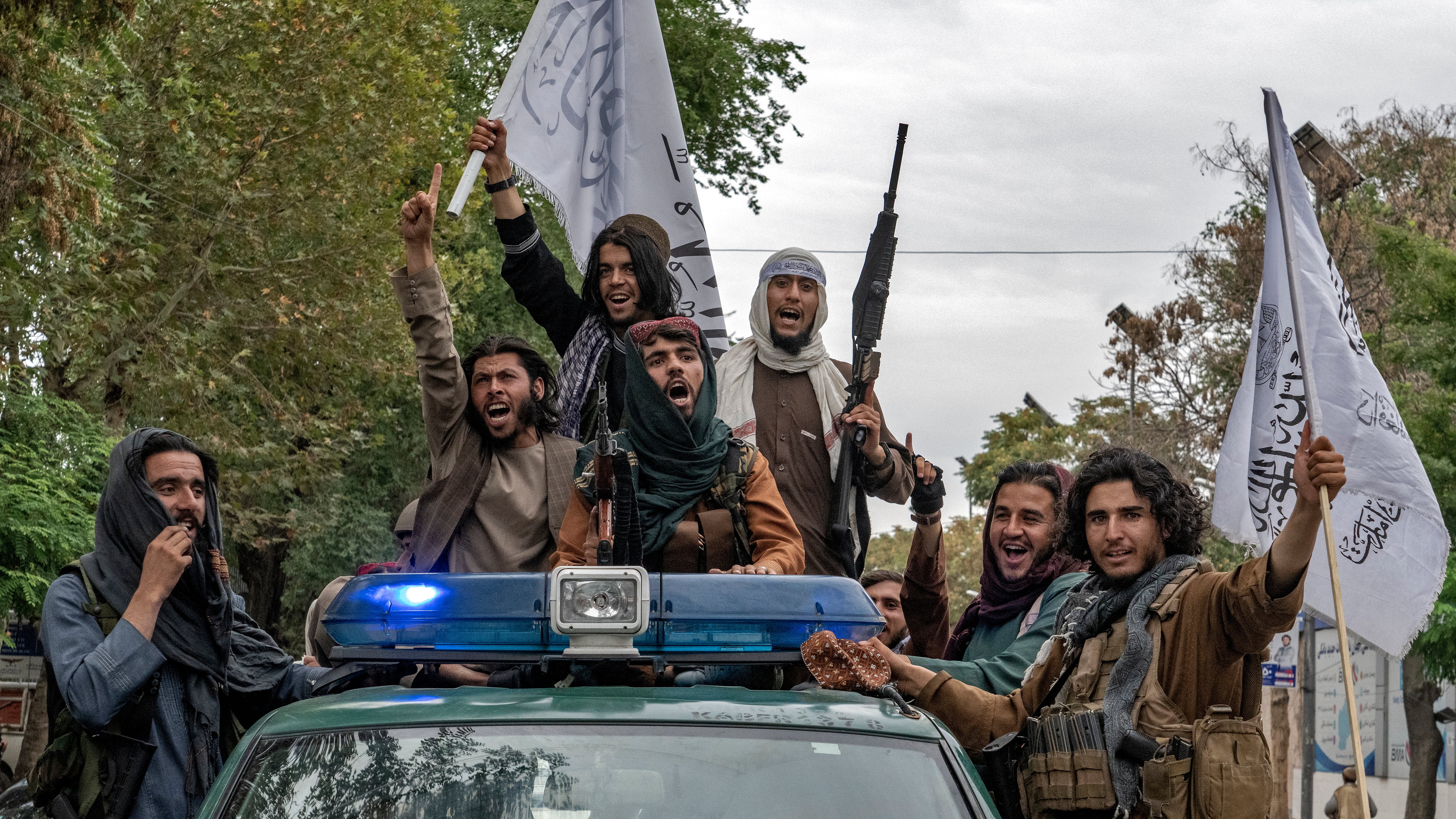 Combatientes del Talibán celebran el primer año desde que tomaron el control de la capital Kabul, frente a la Embajada de Estados Unidos, en Kabul, Afganistán, el lunes 15 de agosto de 2022. (Ebrahim Noroozi/AP)