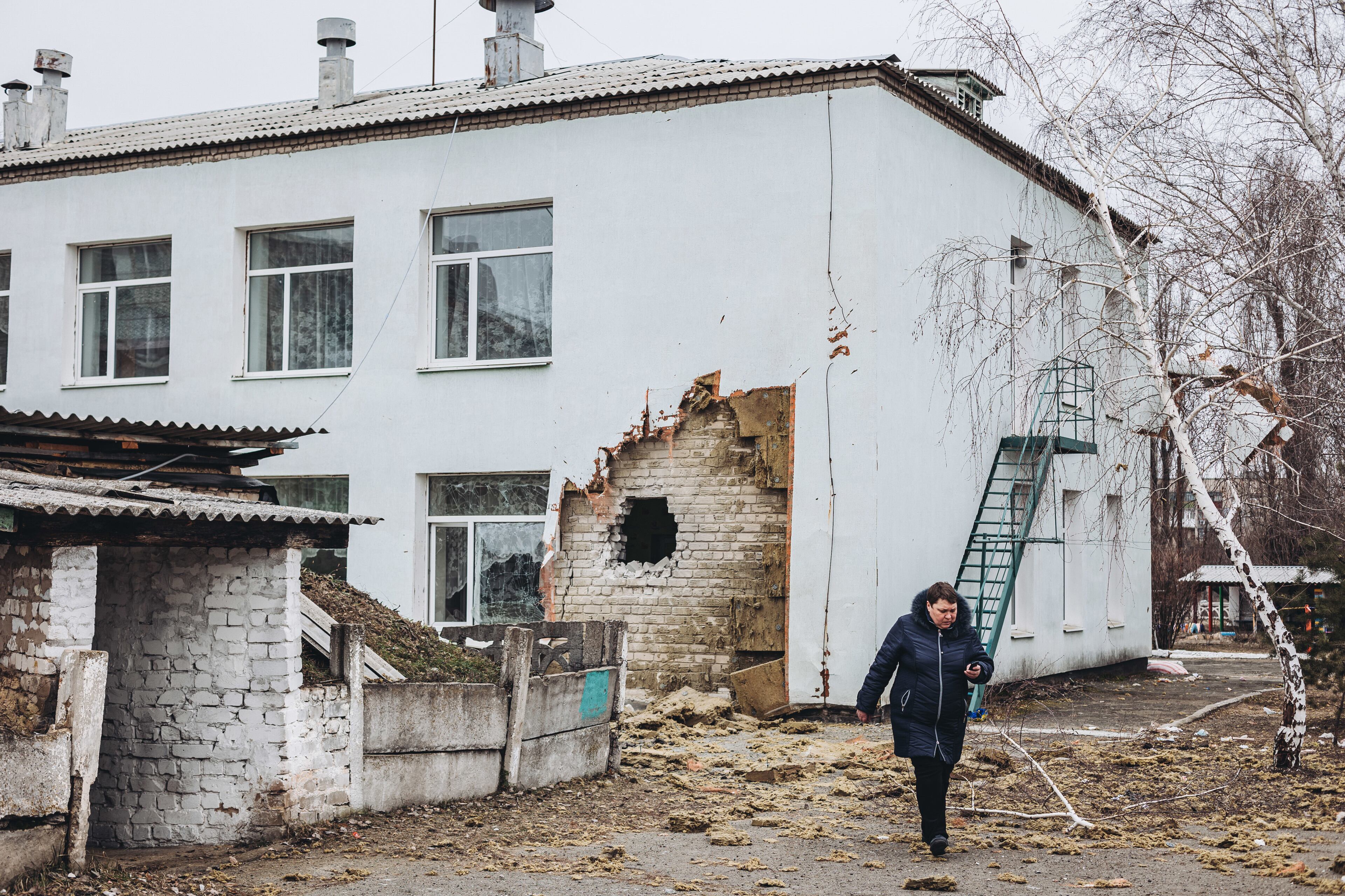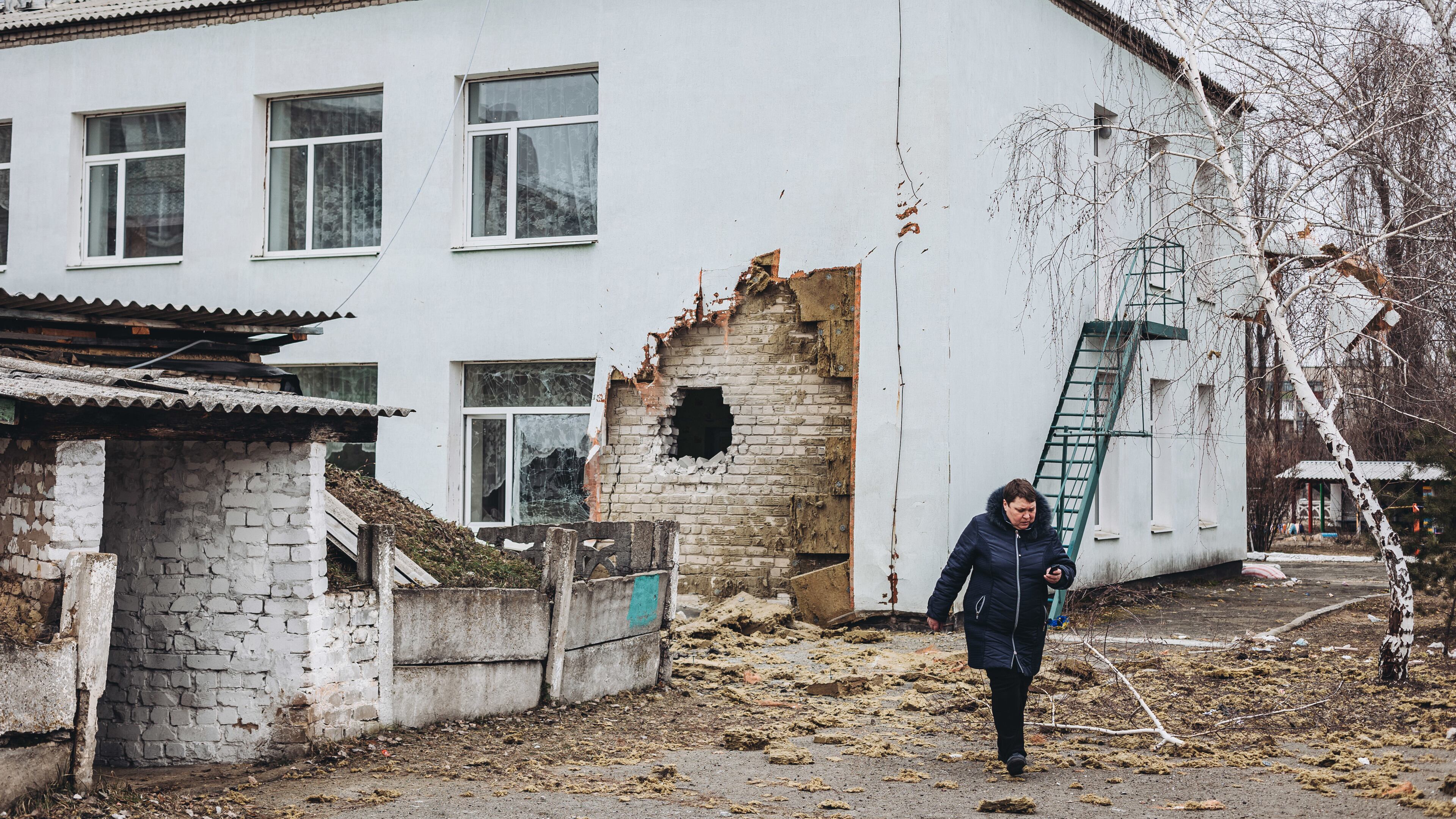 Archivo - Una mujer camina frente a la guardería donde hoy ha impactado un proyectil, a 17 de febrero de 2022, en Stanitsa Luganska, Oblast de Lugansk (Ucrania). Diego Herrera - Europa Press - Archivo (Diego Herrera - Europa Press/Europa Press)