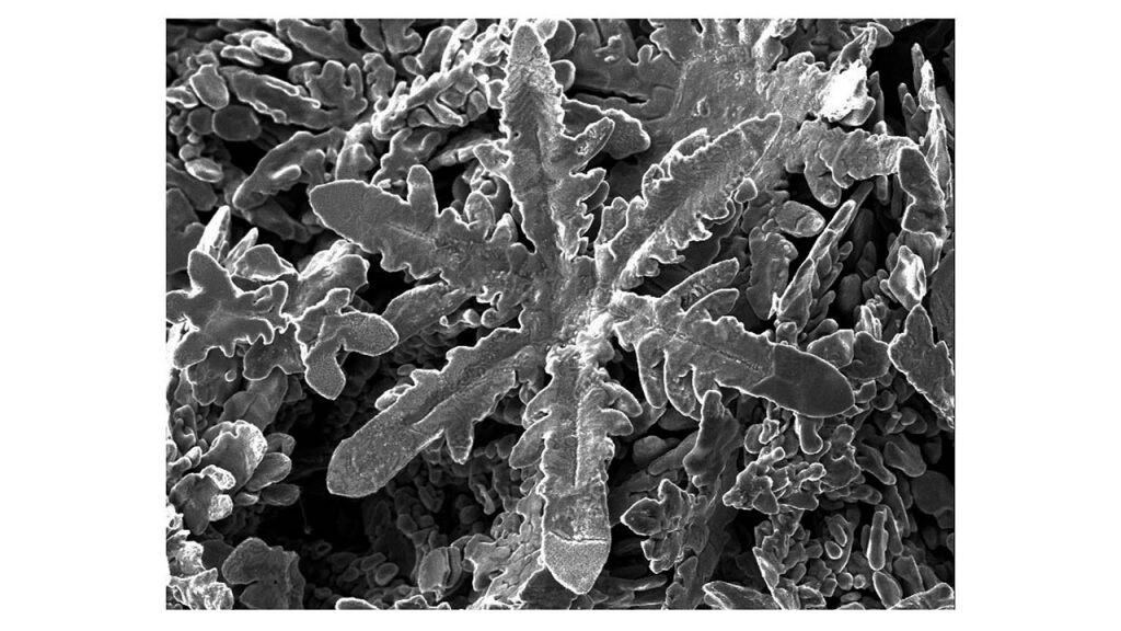Los cristales incluían cubos, varillas, placas hexagonales y formas de copos de nieve de zinc. La simetría de seis ramas del zinc, con cada átomo rodeado por seis vecinos a distancias equivalentes, explica el diseño del copo de nieve.
