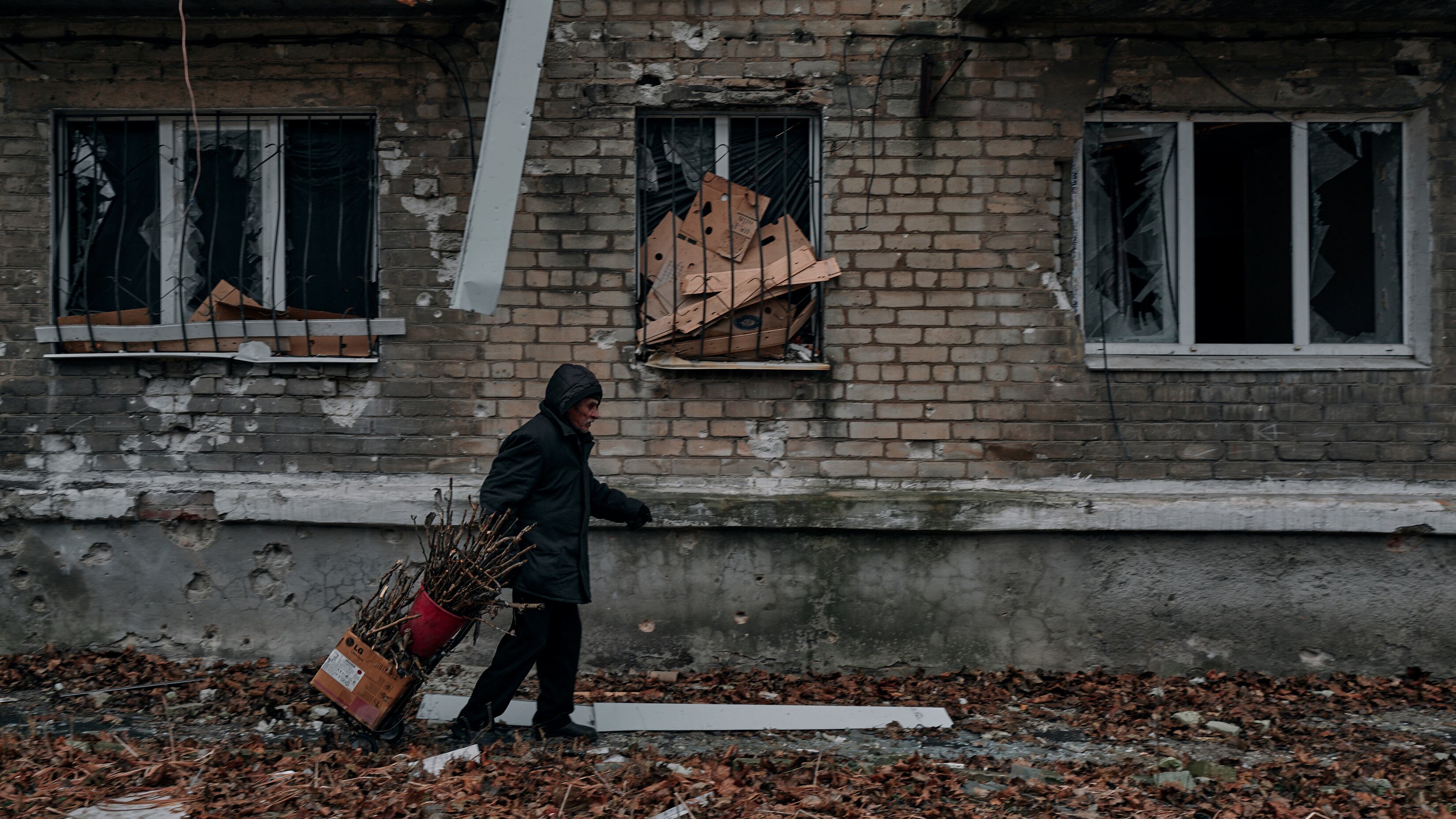 Un hombre lleva ramas secas para una estufa de leña en una casa en Avdiivka, Ucrania, el jueves 8 de diciembre de 2022. (Foto AP/LIBKOS) AP (LIBKOS/AP)
