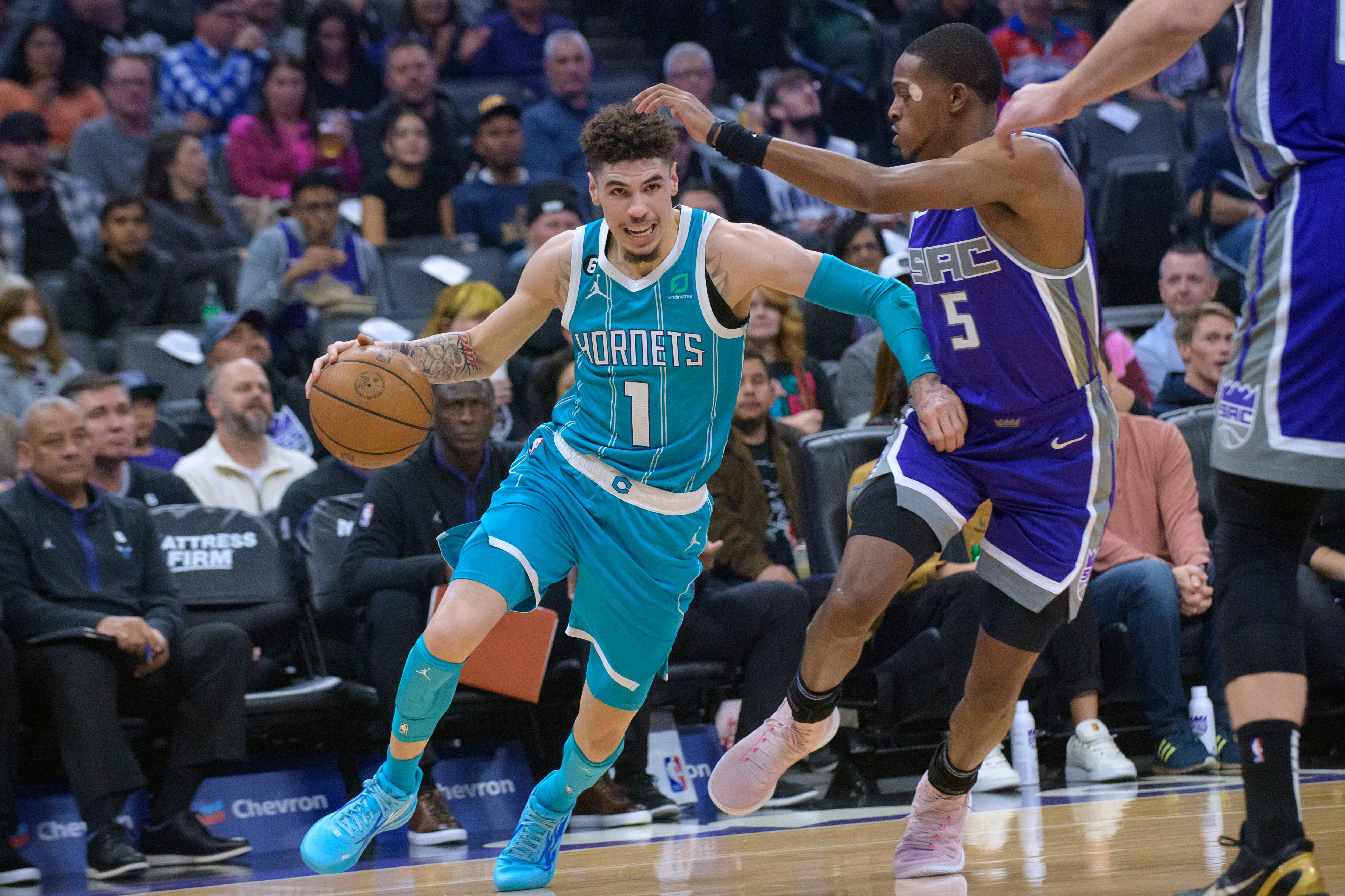 El jugador de los Charlotte Hornets LaMelo Ball (1) trata de eludir al jugador de los Kings de Sacramento De'Aaron Fox (5) en el primer cuarto de su juego de NBA en Sacramento, California, el lunes 19 de diciembre de 2022. (AP Foto/Randall Benton) AP (Randall Benton/AP)