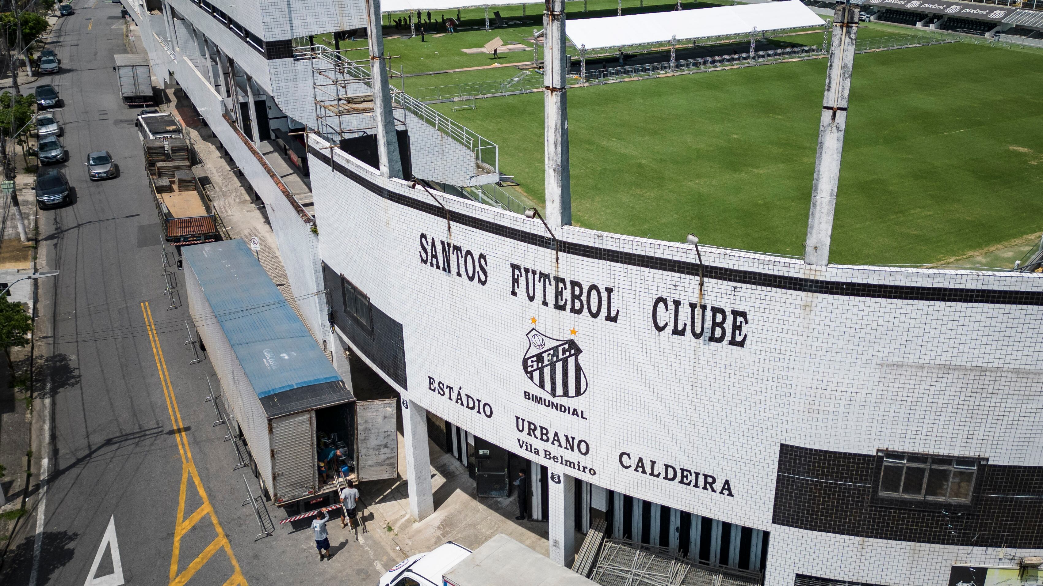 En foto del domingo 25 de diciembre del 2022, trabajadores colocan tiendas en el Estadio Vila Belmiro, casa del club Santos FC. El jueves 29 de diciembre del 2022, el club Santos confirma que el funeral se llevará a cabo en el estadio el lunes y martes. AP (Matias Delacroix/AP)