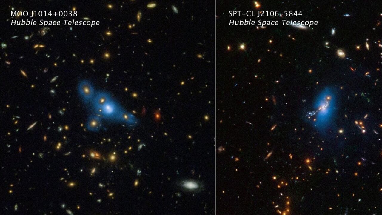 Aquí se muestran imágenes del telescopio espacial Hubble de dos cúmulos masivos de galaxias denominados MOO J1014+0038 (panel izquierdo) y SPT-CL J2106-5844 (panel derecho). El color azul añadido artificialmente se traduce a partir de datos del Hubble que captaron un fenómeno llamado luz intracúmulo. Este resplandor extremadamente tenue traza una suave distribución de luz procedente de estrellas errantes dispersas por el cúmulo. Hace miles de millones de años, las estrellas se desprendieron de sus galaxias progenitoras y ahora vagan a la deriva por el espacio intergaláctico.