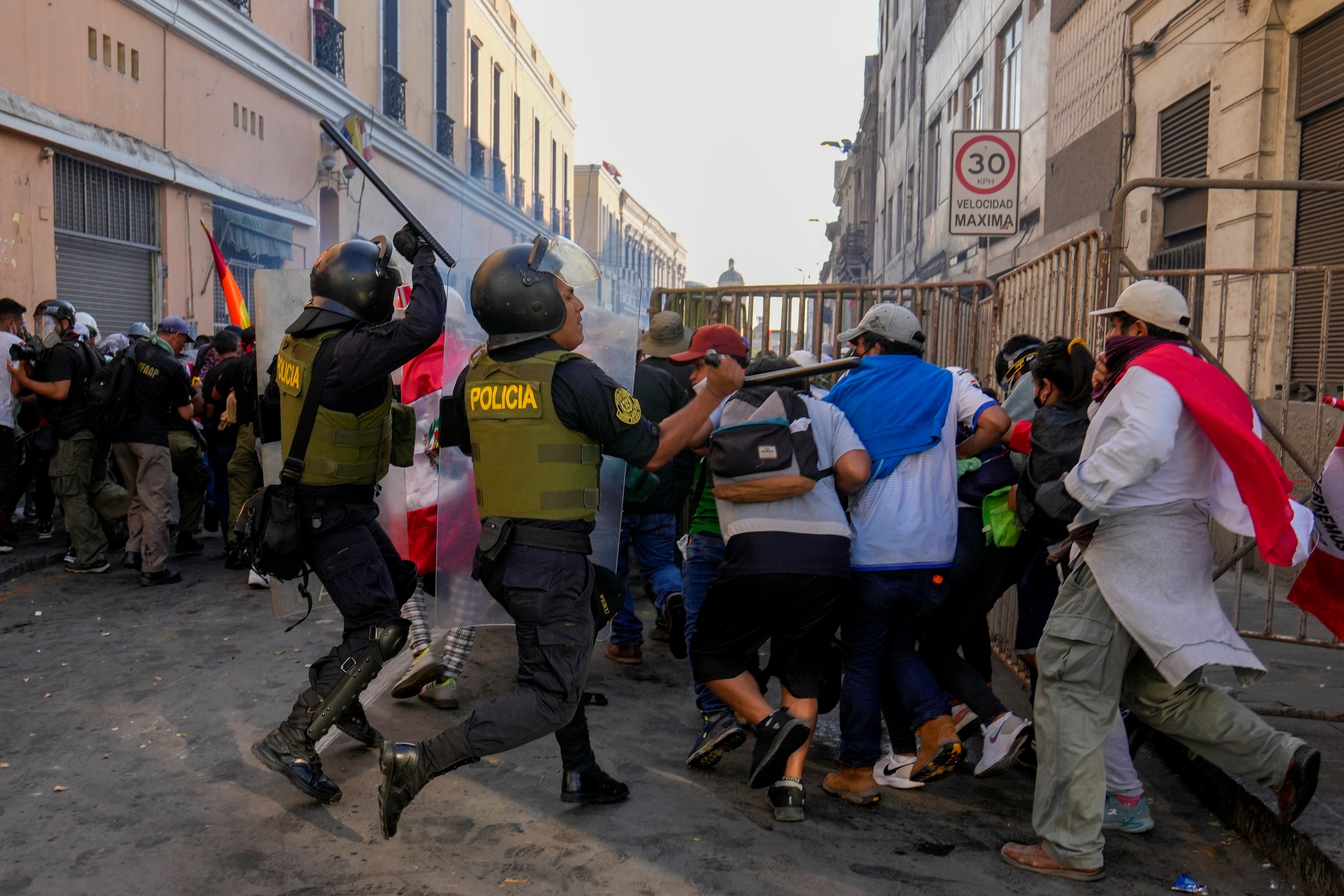 La policía carga contra manifestantes de oposición al gobierno en Lima, Perú, el martes 24 de enero de 2023. Las protestas buscan un adelanto electoral inmediato, la renuncia de Boluarte, la liberación del presidente destituido Pedro Castillo y justic AP (Martin Mejia/AP)