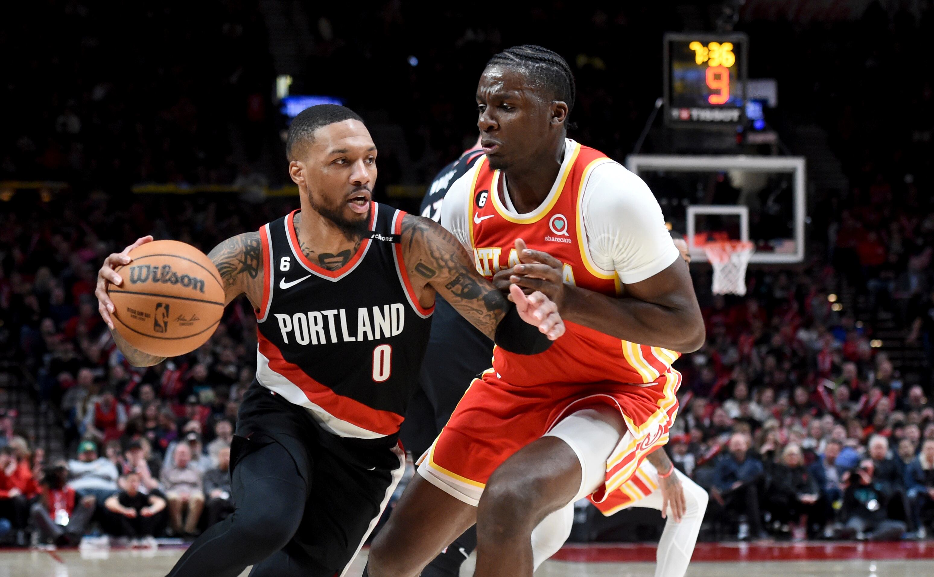 El jugador de los Trail Blazers de Portland Damian Lillard (izquierda) conduce la pelota a canasta ante Clint Capela, de los Hawks de Atlanta, en la segunda mitad del partido de la NBA que enfrentó a ambos equipos en Portland, Oregon, el 30 de enero de 2 AP (Steve Dykes/AP)
