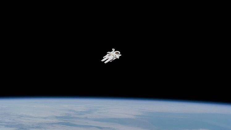 Esta vista orbital imponente muestra a McCandless moviéndose en completa autonomía en el espacio. En contacto con el centro de mando en Houston, y recordando a Neil Armstrong cuando llegó a la Luna, McCandless dijo: "Puede haber sido un pequeño paso para Neil, pero es un gran salto para mí".