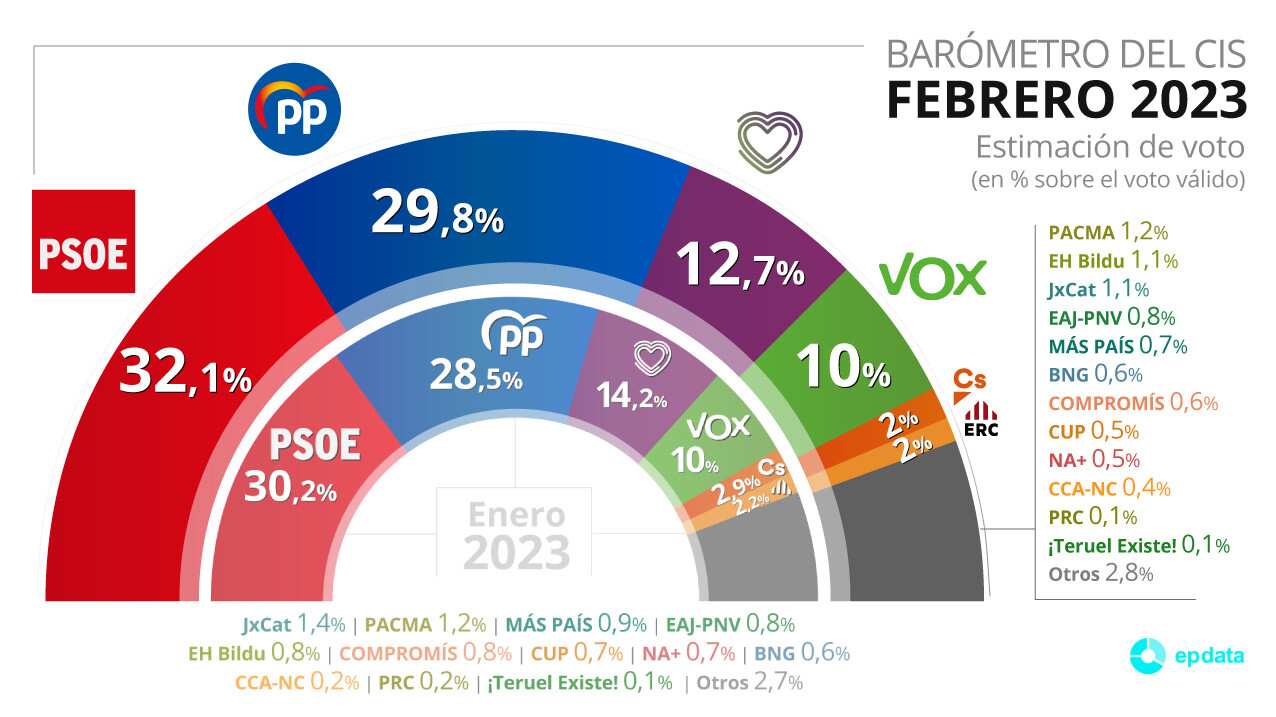 En concreto, el CIS atribuye al PSOE una estimación de voto del 32,1% frente al 29,8% del PP, mientras que Vox repite en el 10%, igual que el mes anterior. Quien pierde fuelle es Unidas Podemos, que baja del 14,2% de enero a un 12,7% en febrero.