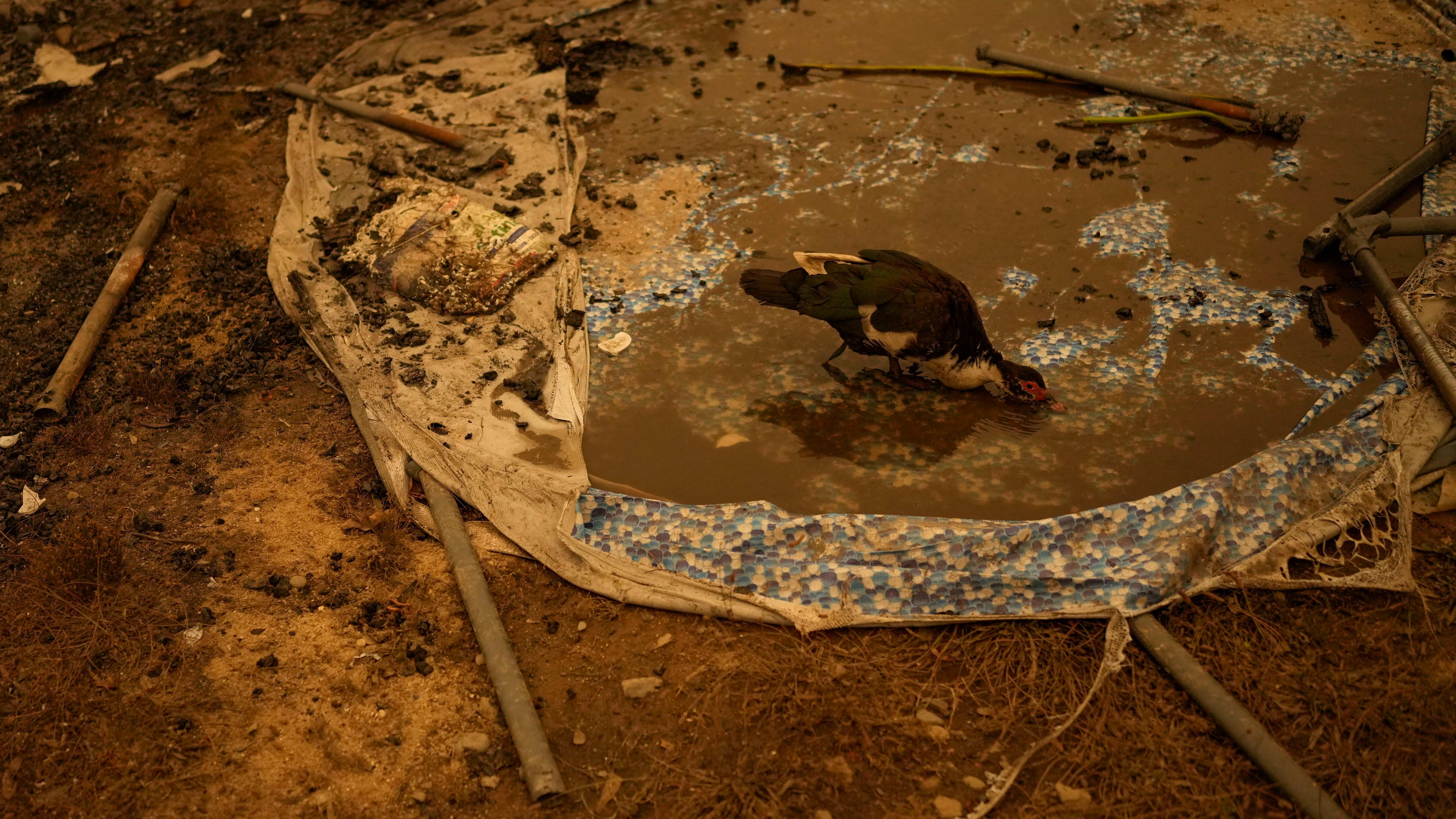 Un pato bebe agua de una piscina de plástico destruida en un incendio en Santa Juana, Chile, el domingo 5 de febrero de 2023. Los incendios se extendieron por el sur y centro de Chile, provocando la evacuación de zonas residenciales y la declaración de AP (Matias Delacroix/AP)