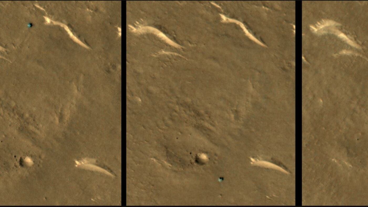 La imagen de arriba procede de tres imágenes adquiridas en 2022 y 2023. El vehículo explorador es el elemento oscuro y relativamente azulado visible en la parte superior central de la primera imagen (izquierda) y en la parte inferior central de las otras dos imágenes. Esta serie temporal muestra que el rover no ha cambiado de posición entre el 8 de septiembre de 2022 y el 7 de febrero de 2023.