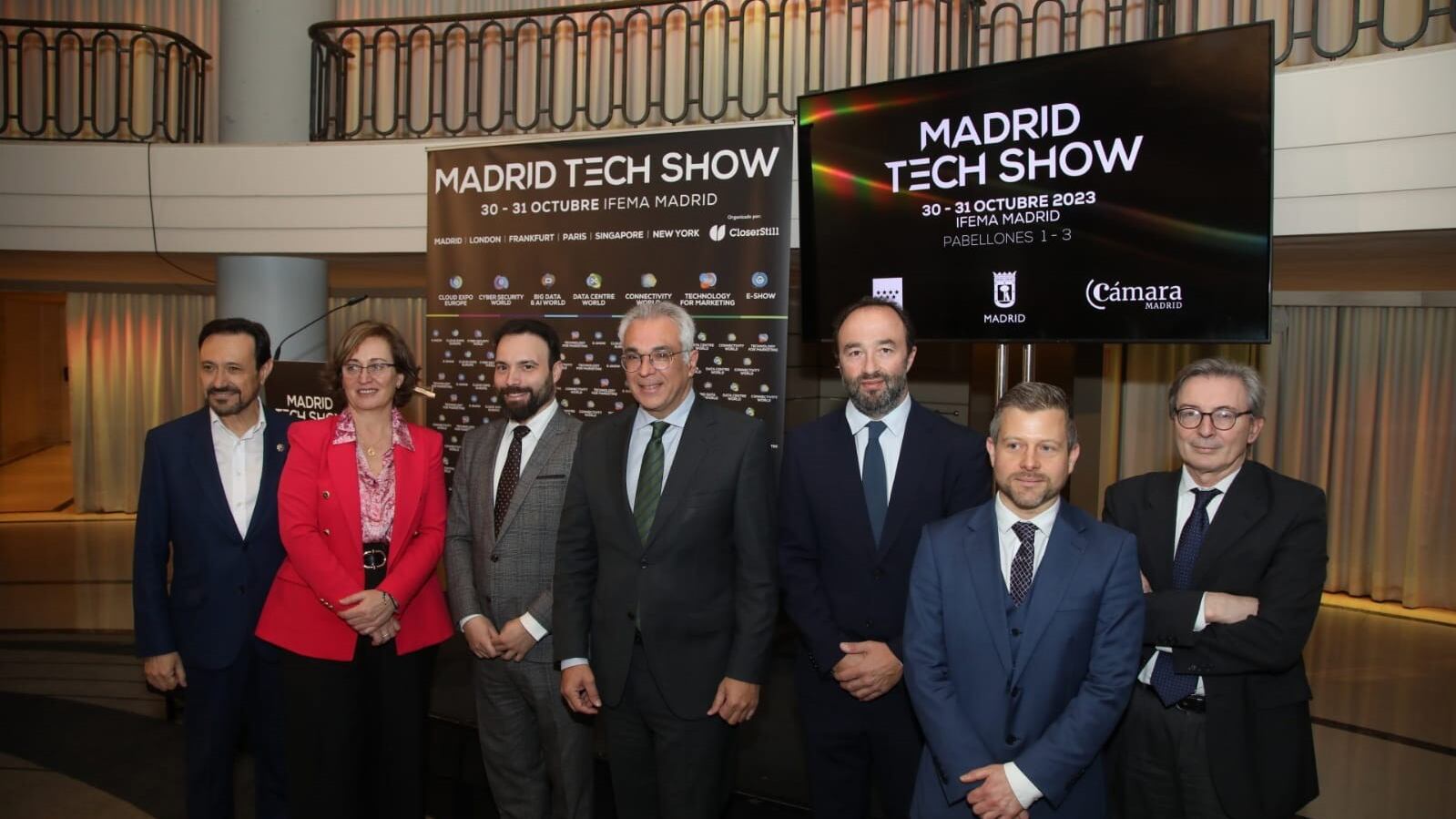 La presentación de Madrid Tech Show 2023 ha contado con la participación del consejero de Administración Local y Digitalización de la Comunidad de Madrid, Carlos Izquierdo; el delegado del Área de Innovación y Emprendimiento del Ayuntamiento de Madrid, Ángel Niño; y la vicepresidenta de la Cámara de Comercio, Industria y Servicios de Madrid, Eva Serrano.