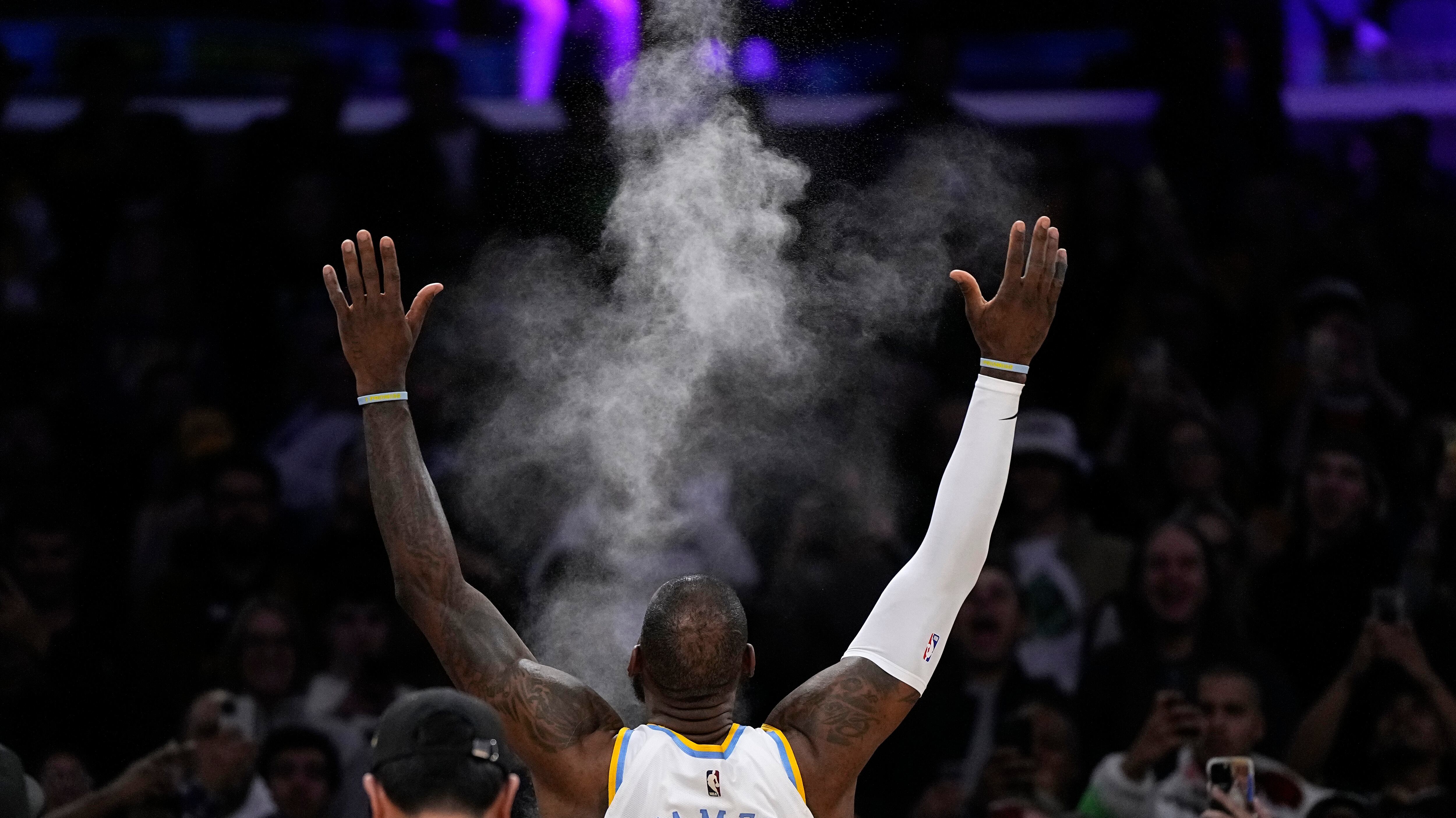 LeBron James arroja polvo al aire antes del inicio del partido de la NBA que enfrentó a su equipo, los Lakers de Los Ángeles, y a los Warriors de Golden State, el 23 de febrero de 2023, en Los Ángeles. (AP Foto/Mark J. Terrill) AP (Mark J. Terrill/AP)
