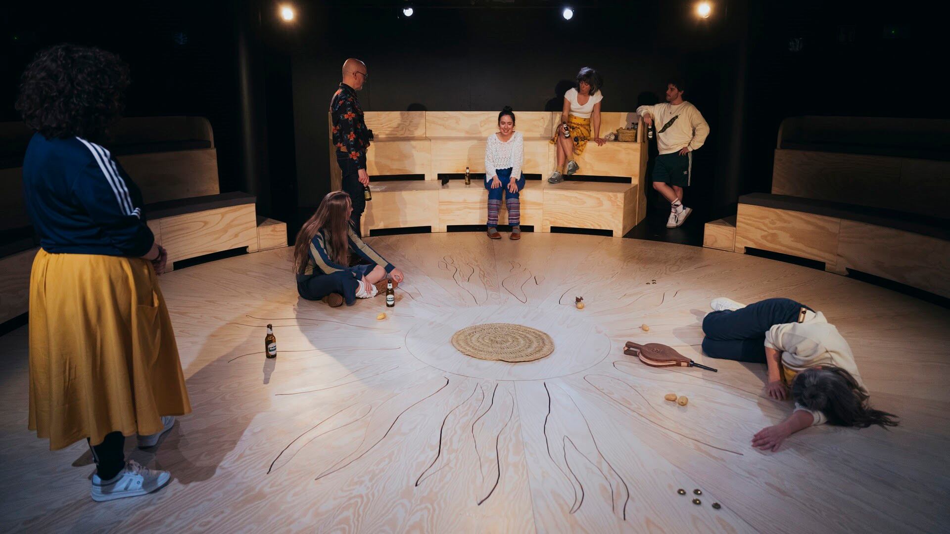 La escenografía de Cecilia Molano congrega al espectador en unas gradas desde las que asistir a un hilo continuo de historias que se van entretejiendo a través de las voces de un elenco coral.