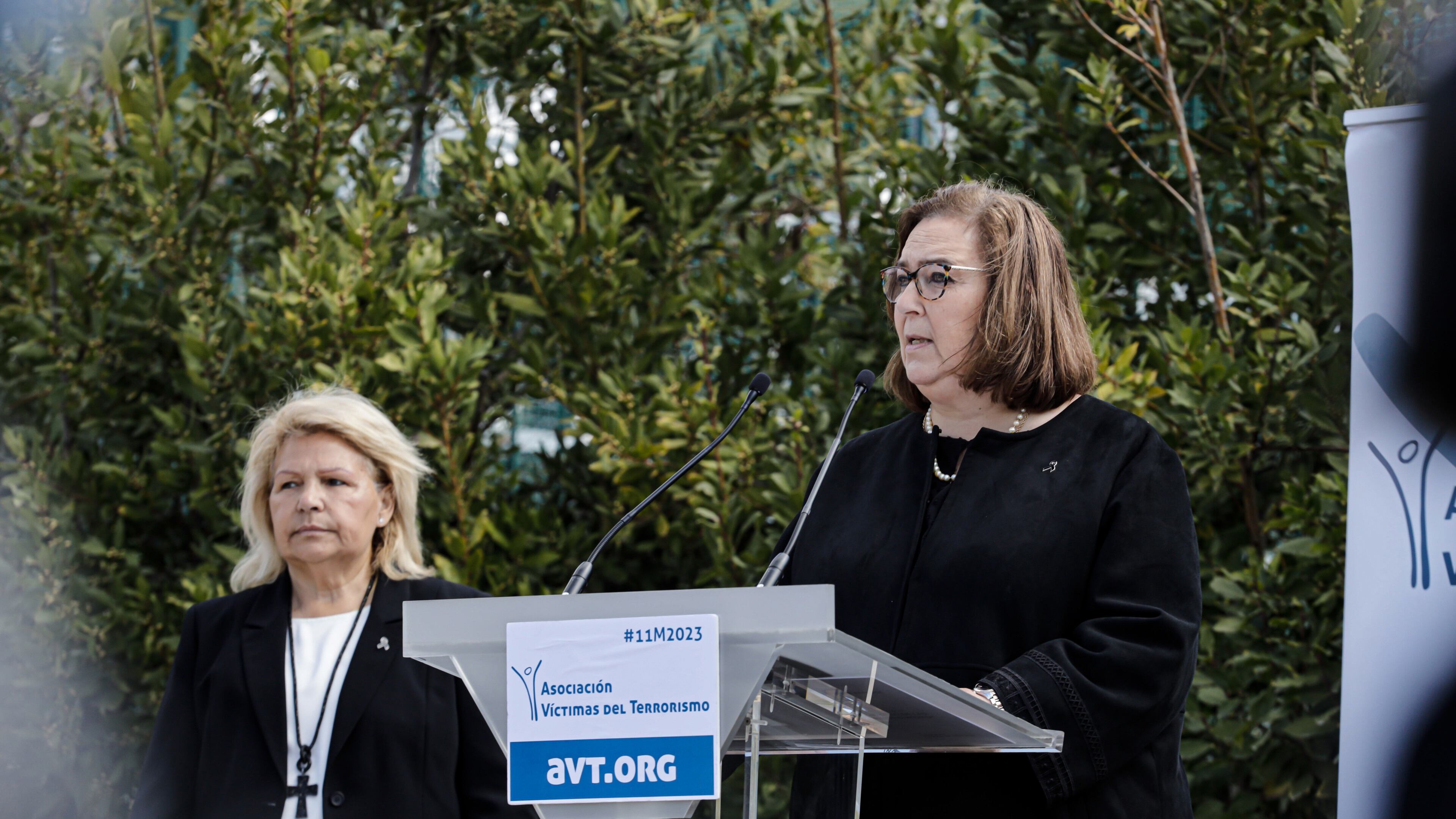 Los asistentes han guardado un minuto de silencio tras las declaraciones de la presidenta de Honor de la AVT y madre de una de las 193 víctimas del 11M, Ángeles Pedraza, quien ha arremetido directamente contra el presidente del Gobierno: "Señor Sánchez, qué caro nos va a salir a las víctimas del terrorismo sus pactos para asegurarse su permanencia en la Moncloa".