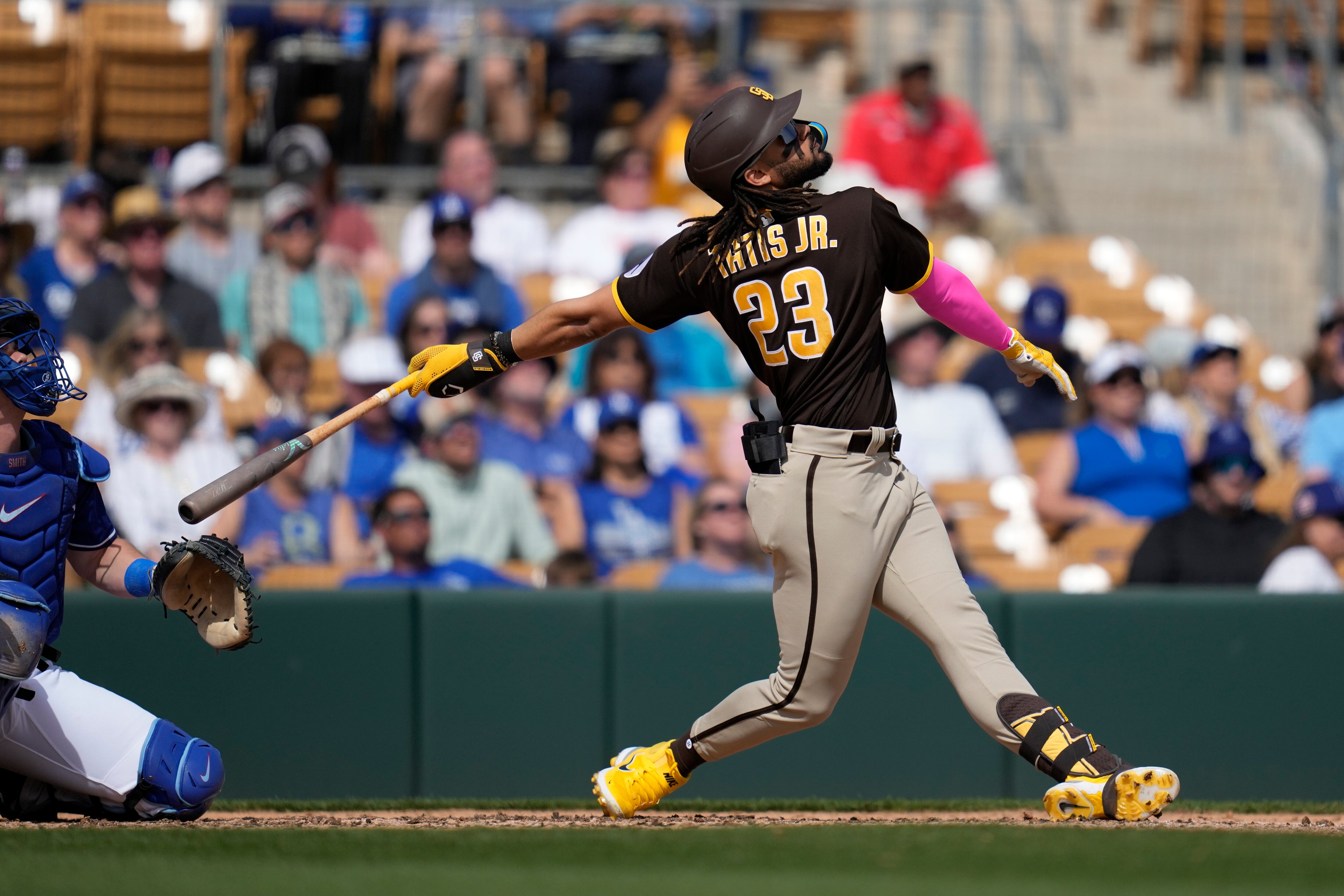 El dominicano Fernando Tatis, de los Padres de San Diego, baea un elevado en el uego del lunes 6 de marzo de 2023, ante los Dodgers de Los Ángeles (AP Foto/Ashley Landis) AP (Ashley Landis/AP)