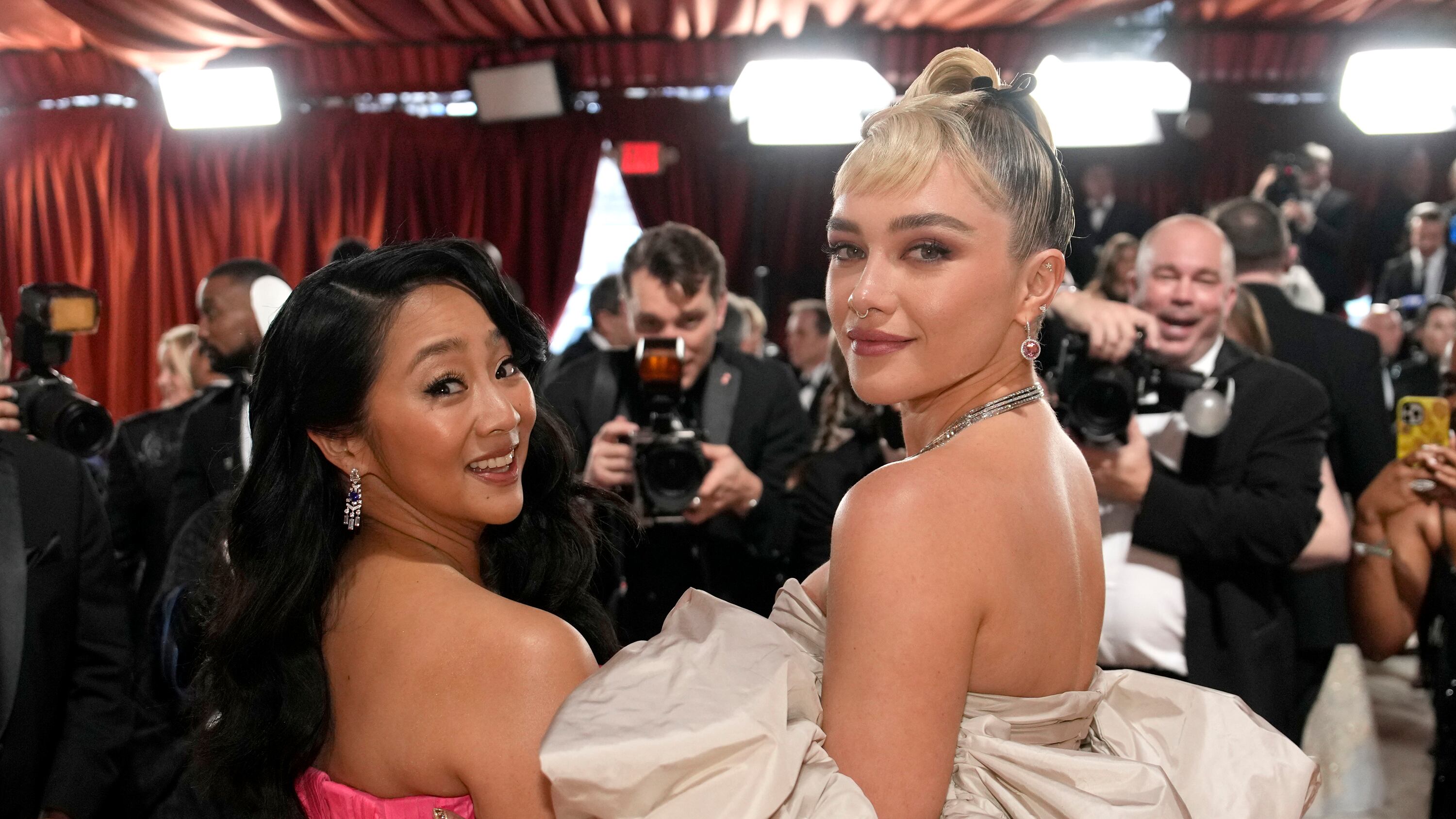 También hubo gritos para Florence Pugh, quien se detuvo para saludar antes de conversar con el actor de ascendencia mexicana Harvey Guillen, de la película nominada “Puss in Boots: The Last Wish” (“El gato con botas: El último deseo”). Guillen estaba emocionado de conocerla, “Te veré en un rato”, dijo. Pugh esperó pacientemente mientras Stephanie Hsu tenía su momento con los fans, para hablar y desearle suerte a la nominada a mejor actriz de reparto.