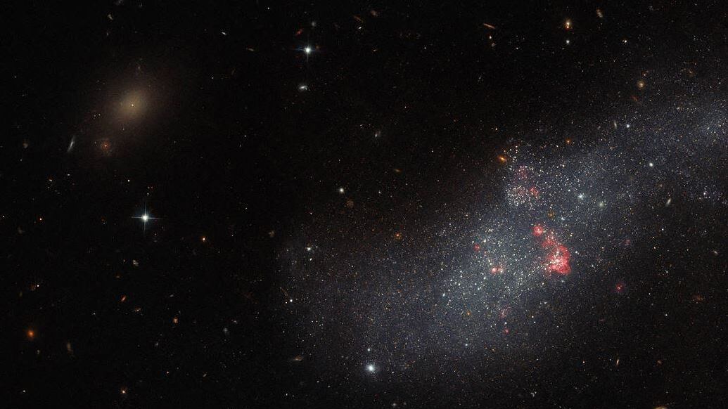 La pequeña galaxia consiste en una banda difusa de estrellas que contienen burbujas rojas de gas que marcan regiones de formación estelar reciente y se encuentra aproximadamente a 26 millones de años luz de la Tierra en la constelación de Corvus.