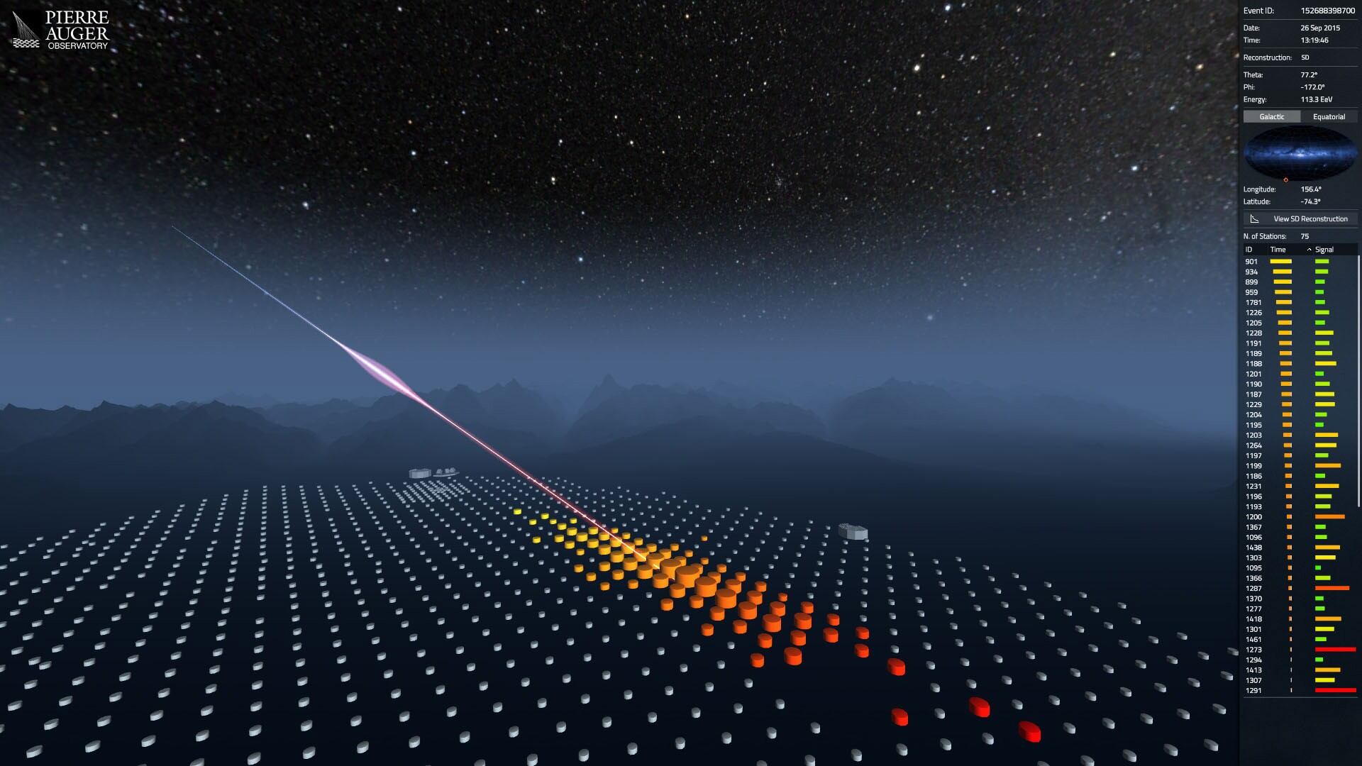 Por ello, es necesario contar con detectores que cubran grandes áreas, como es el caso del Observatorio Pierre Auger en Mendoza (Argentina), el más grande del mundo, que abarca una superficie comparable a la isla de Mallorca.